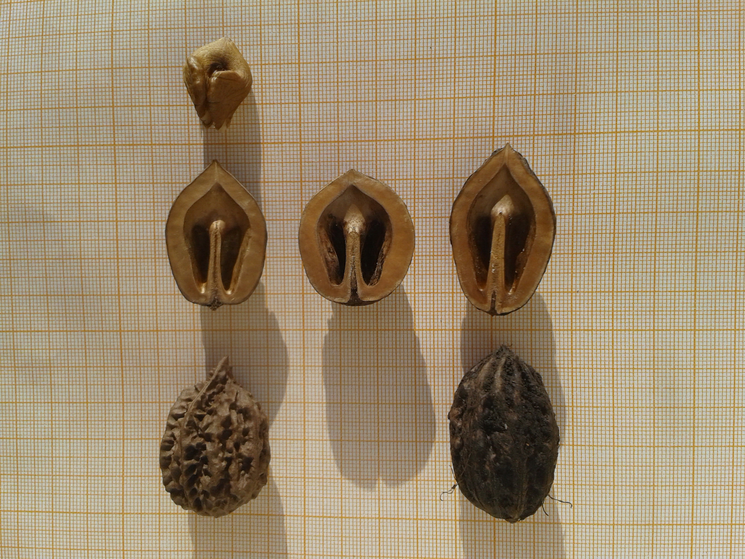 Орех среднего размера (ближе к крупному), удлиненный. Ядро извлекается половинками или крупными кусочками. Полости расширенные. Перемычка часто ломается. Сам орех часто ломается перпендикулярно шву ("лепестки" ядра остаются на половинках.) Термическим способом ядра тоже не плохо извлекаются. Извлёк ядра у трёх из пяти орехов. Полости расширенные (почти как у ореха Зибольда), сужающимся внутрь клином. Средний вес ореха 7,53 г. (максимальный 9,34 г.), средний вес ядра 1,48 г. (максимальный 1,94 г.). Процентный выход ядра (по весу) - средний 19,6% (максимальный 20,77%).