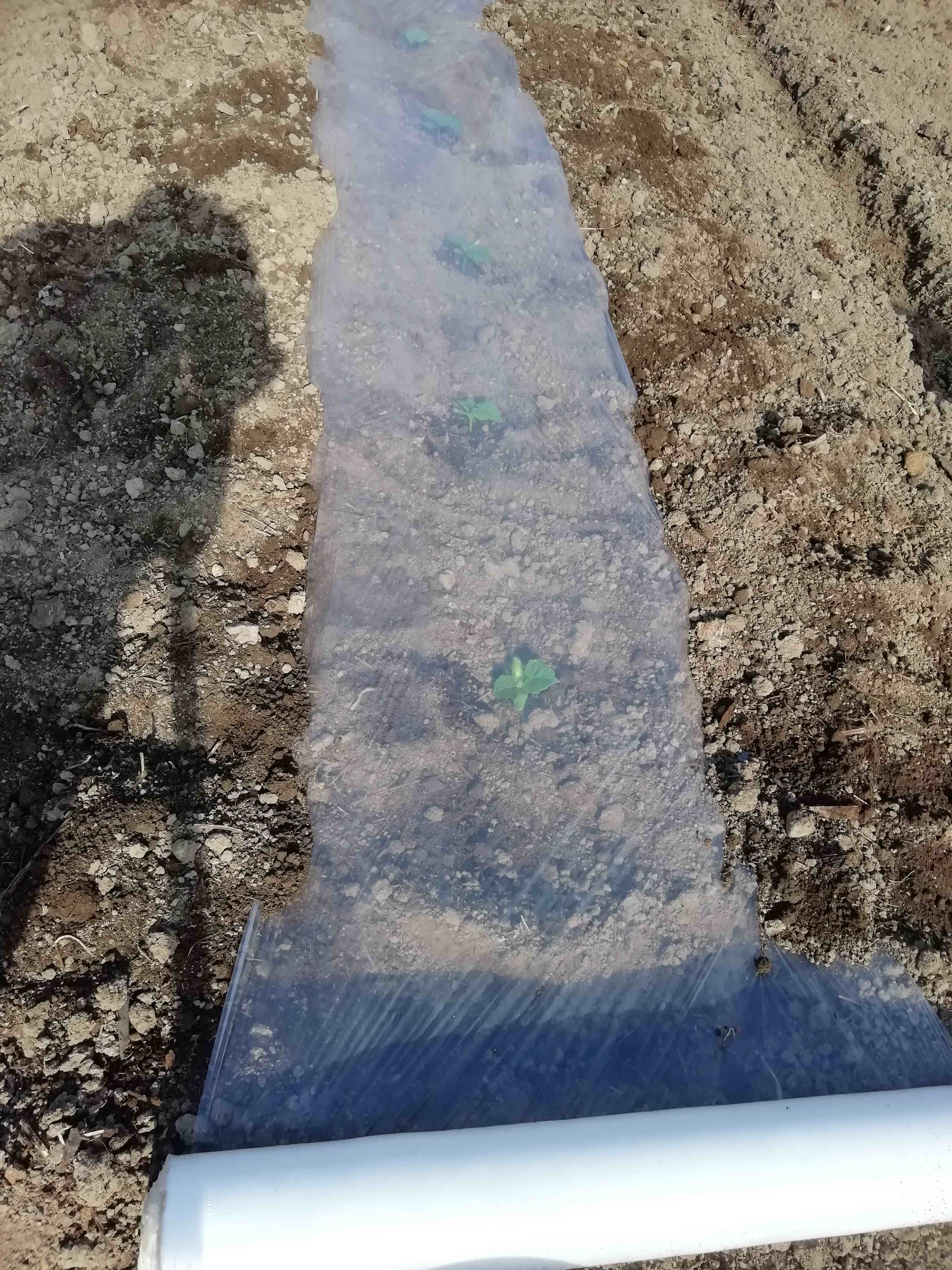 3. Расстилаю и прикапываю плёнку прямо поверх рассады. Сначала прикапываю торец, потом постепенно раскатываю рулон и прикапываю. Только не надо сильно натягивать по бокам, чтобы потом был запас для прилегания к лунке.
