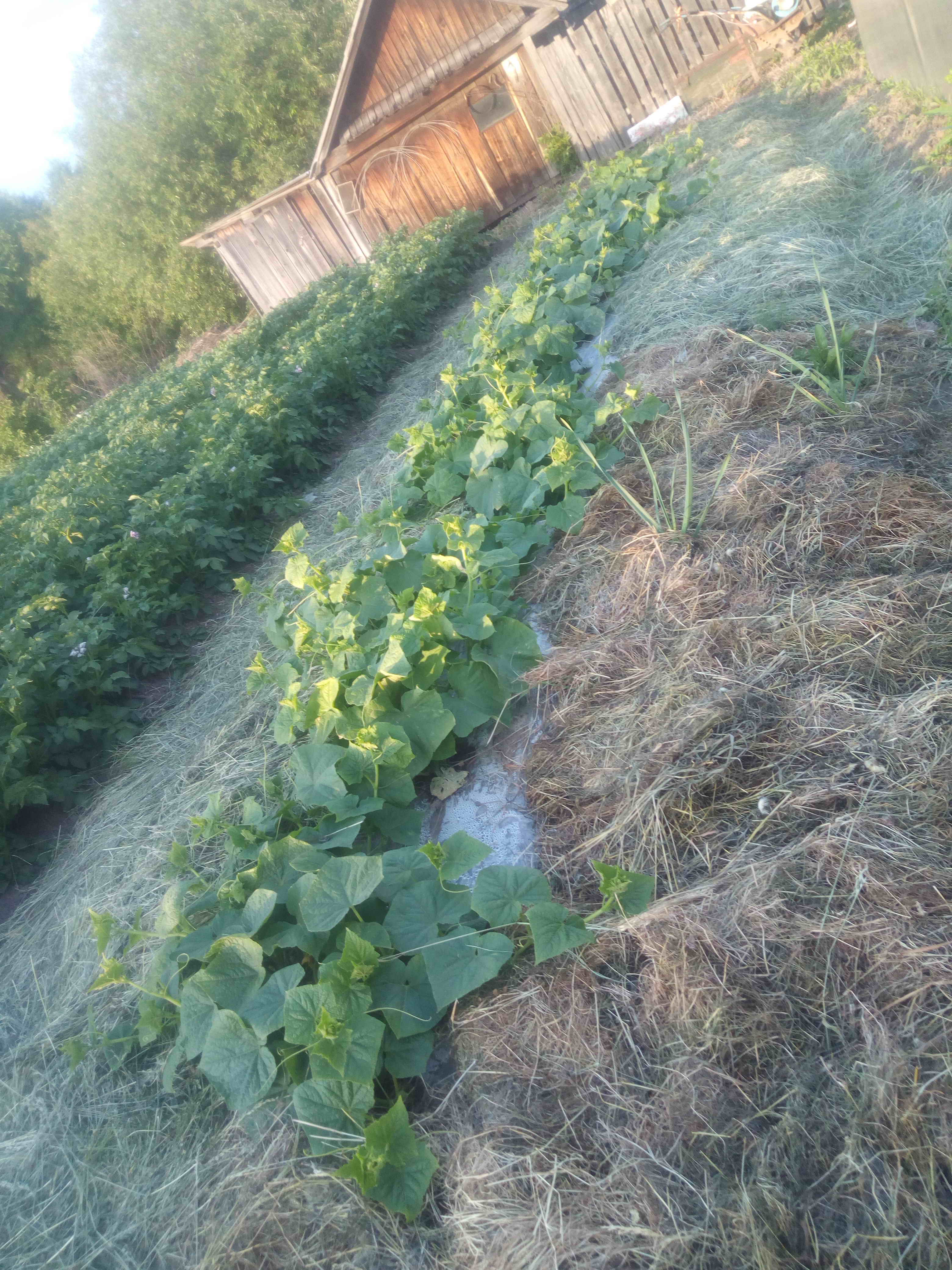 Плёнку не накрываю, чтобы корни прогревались. Справа клочок, накрытый старым сеном, остальное - свежаком. Слой толстый, сантиметров 15-20, особенно зелёнку, иначе она быстро усохнет и придётся добавлять, а сорняки пробьются. Что касается семян арбузных, следующей весной напомни мне, я поделюсь. Адрес у меня сохранился