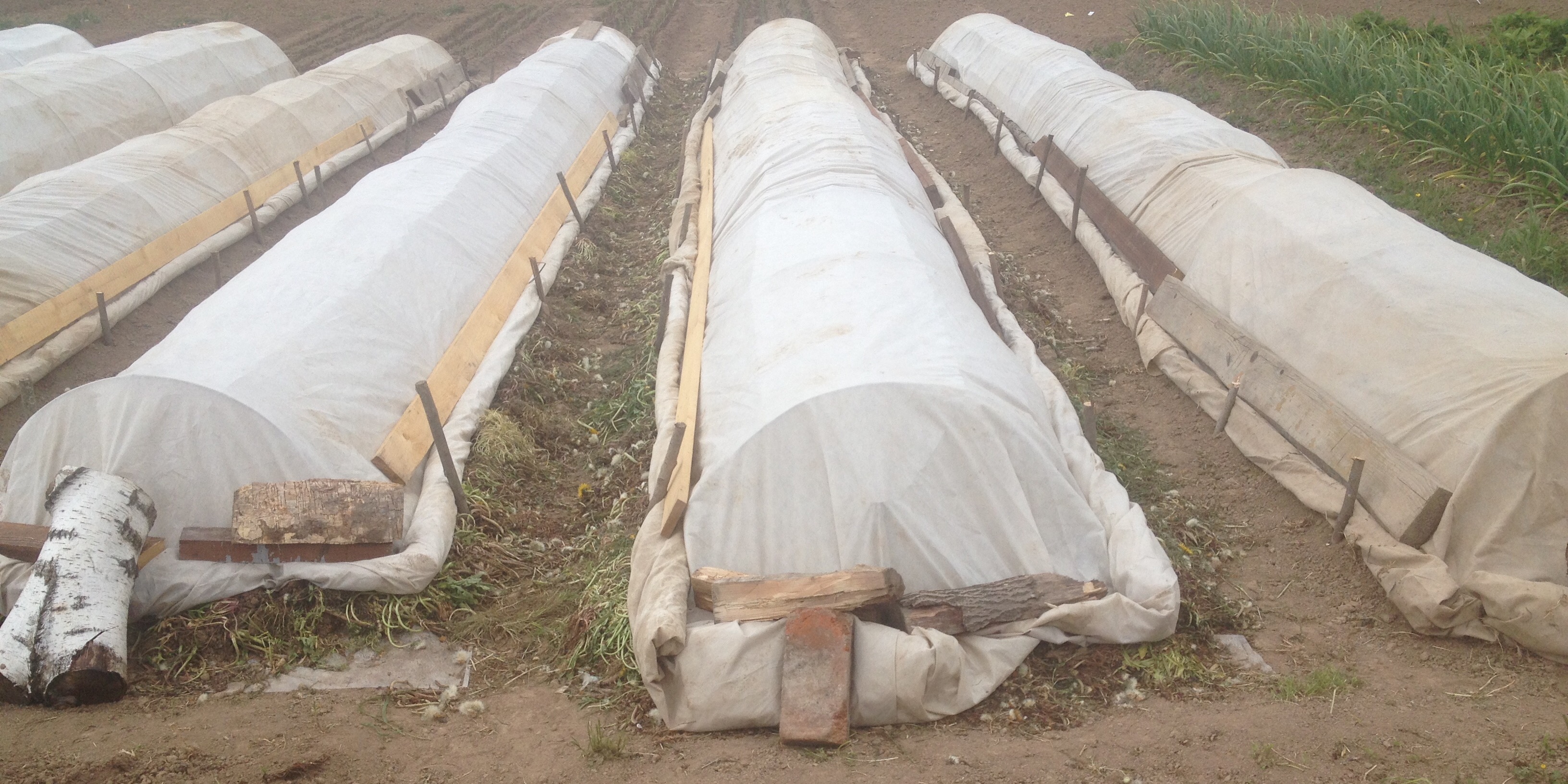 . Надо было видеть, на какую раскоряку приходилось делать воротнички , а главное - в случае сильного похолодания при такой ранней посадке в ог у меня всегда был шанс накрыть сверху нетканкой (у меня она тоже 1,5 м. шириной), теперь надеюсь на погоду. С 1 мая ни дождичка, земля почти в пыль. В этом году из-за нехватки железных дуг приноровилась делать укрытие на палочках, пригодился опыт натягивания тента на морском отдыхе. Получается неплохо, потому что можно регулировать высоту.