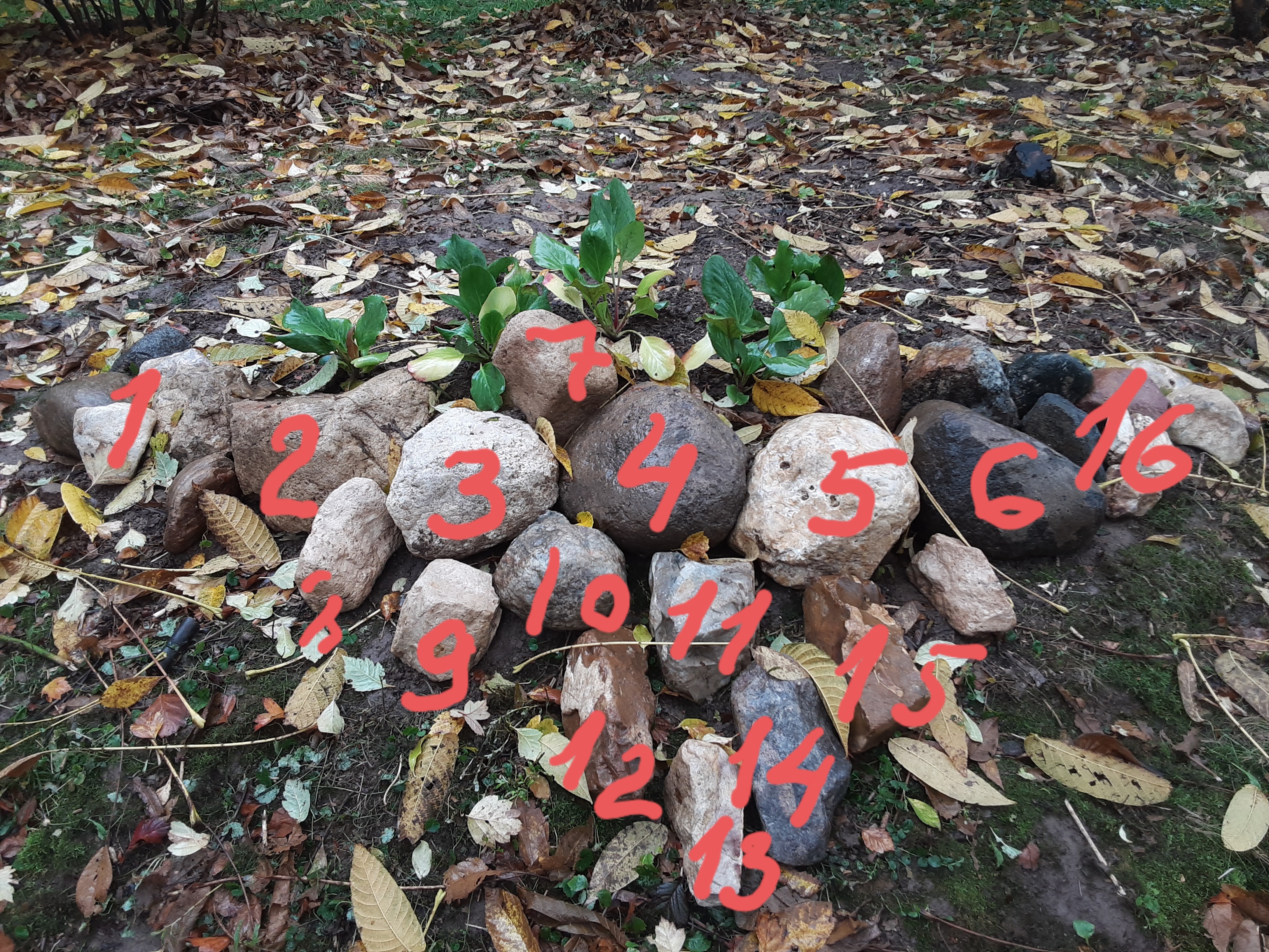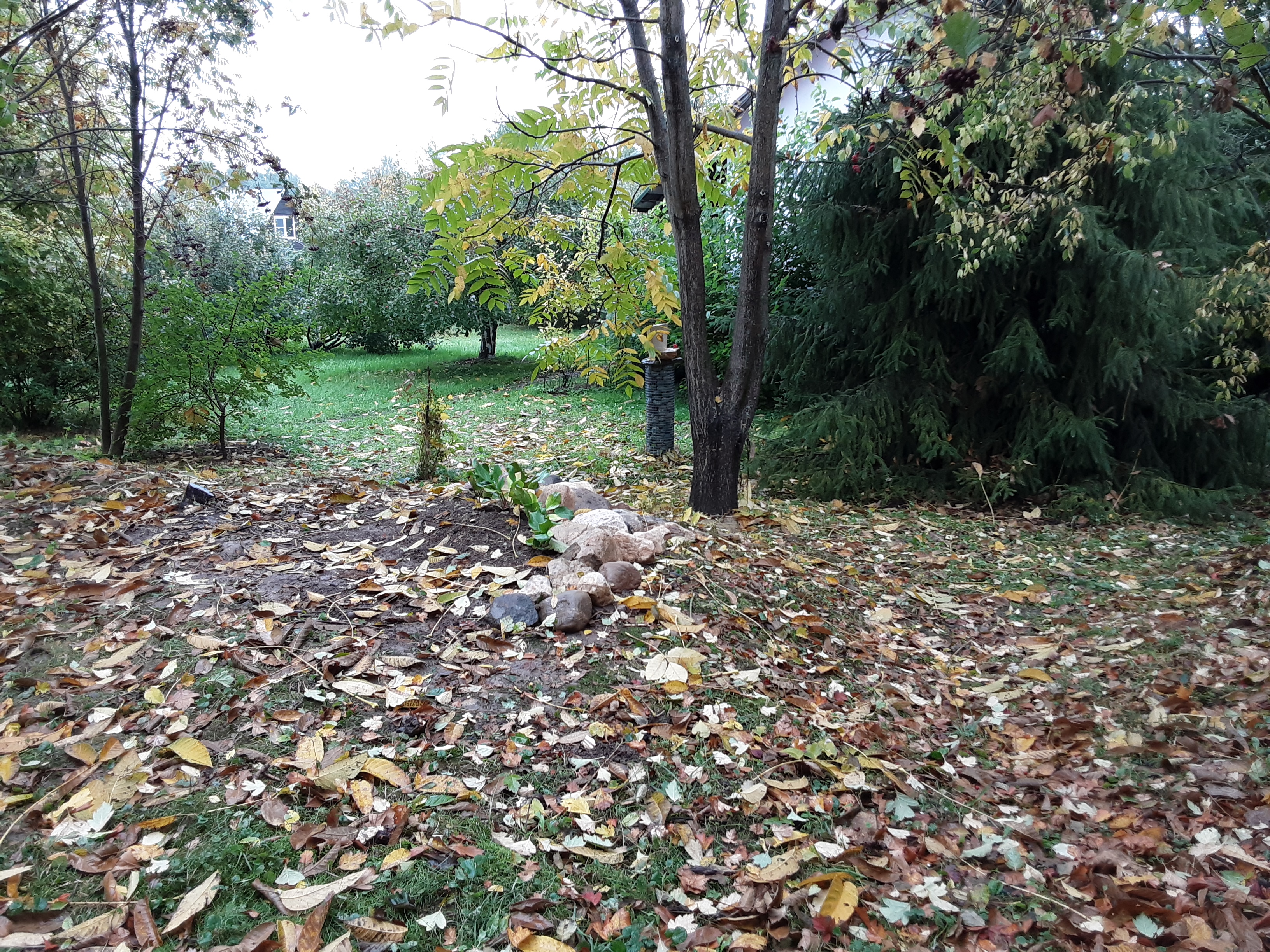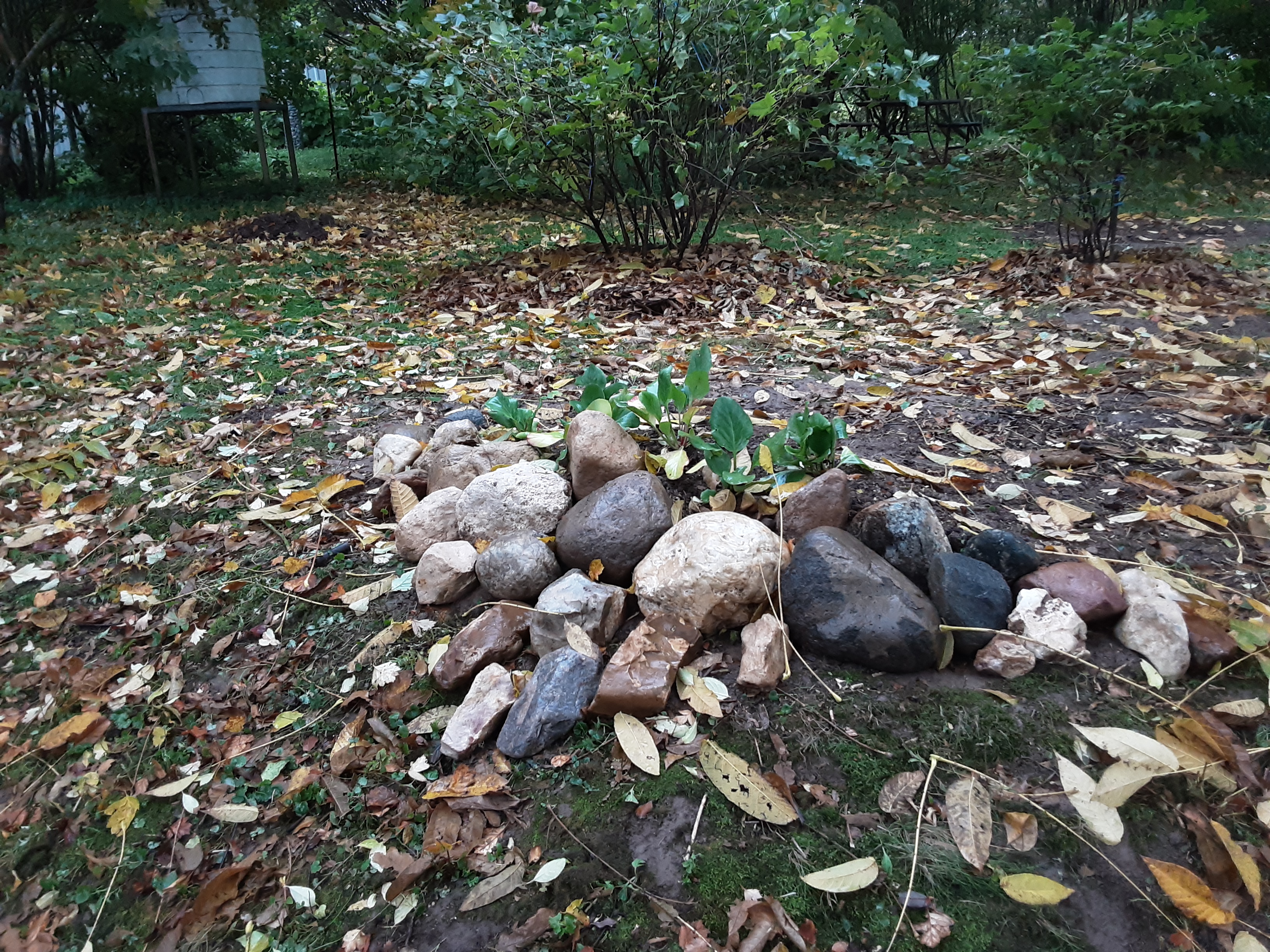 А хосты можно в саду посадить и без камней. Только не просто на поле, а всё же под деревом. Или делать композицию более крупной. Марина права, маленькая кучка камней теряется в таком пространстве.