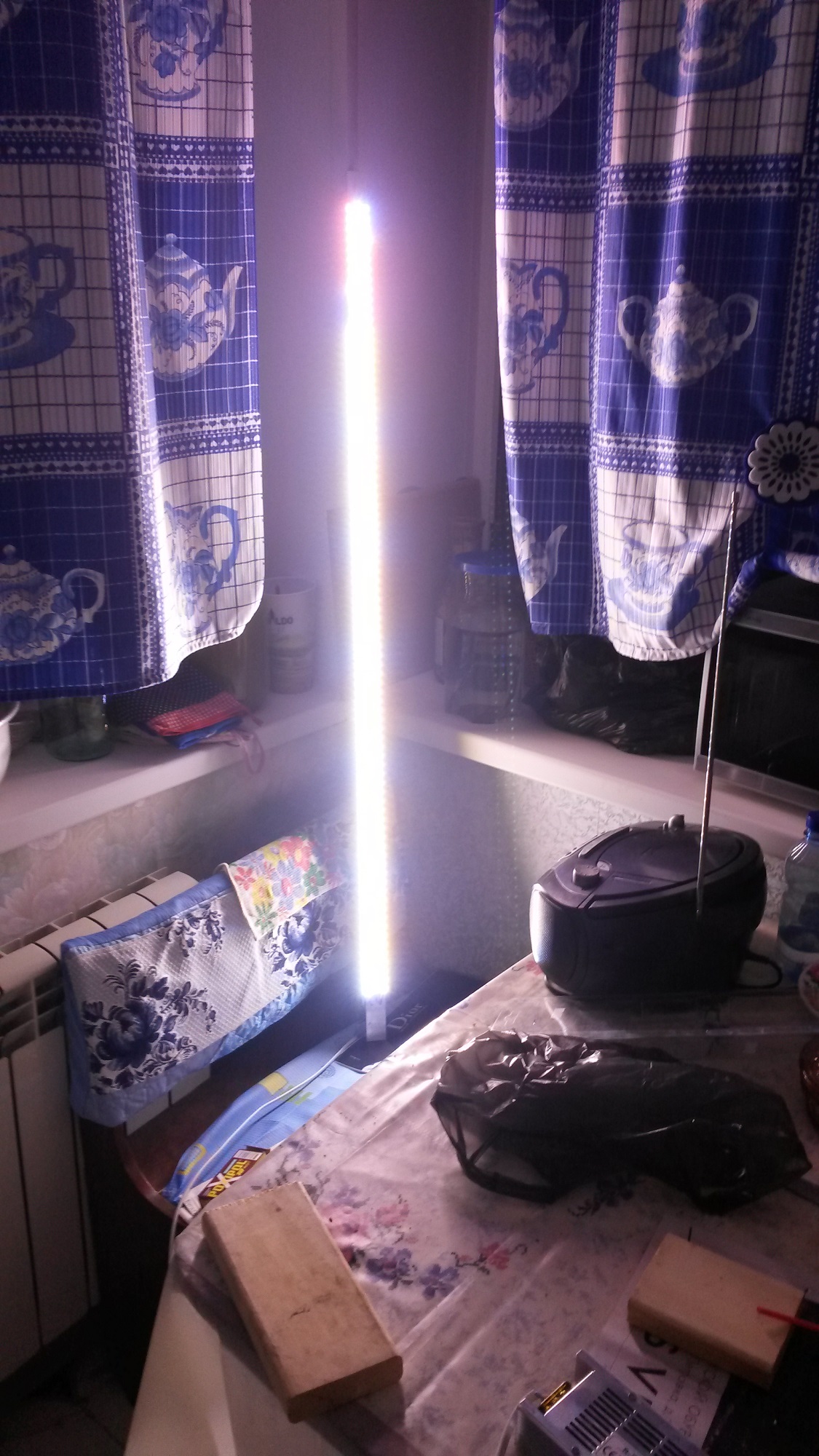 Стоимость всей конструкции - две лампы длиной 130см (по одной на окно), преобразователь напряжения, розетка: