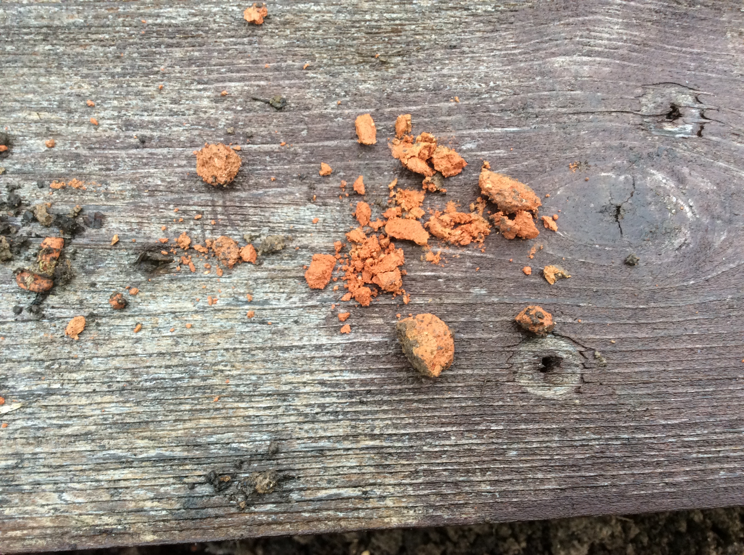 Эту рыжую глину (?) собрала в пакетик, может и найду время, надо посмотреть, где эти лаборатории в нашем районе. Ну не от ржавой же крышки такое с перцами было...