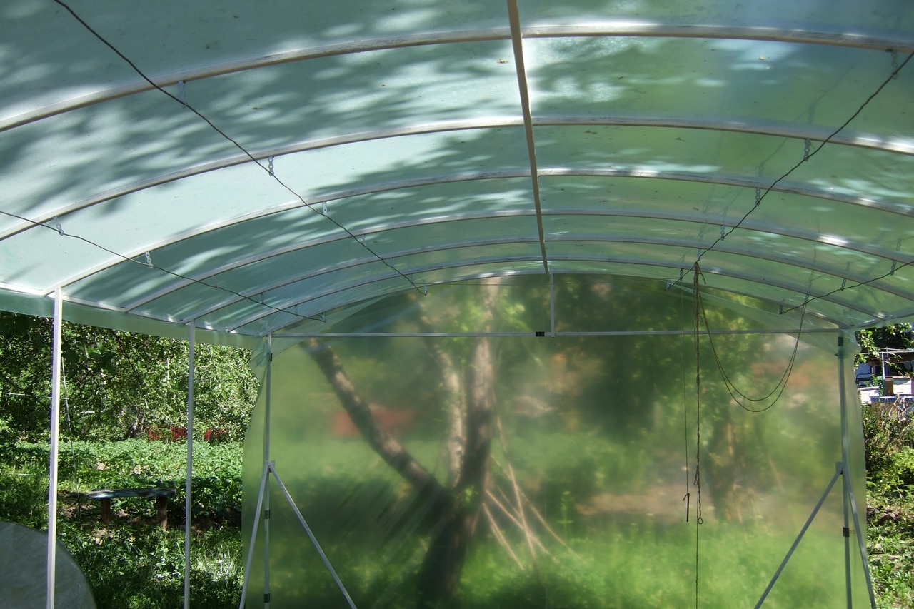 В 2013-м году посадил как в Питере - под дуги, как доросли до пленки - открыл. А когда почернели разом все, то забросил. Друзья растили под навесом. Вот и я себе сделал, но с удобным креплением пленки.