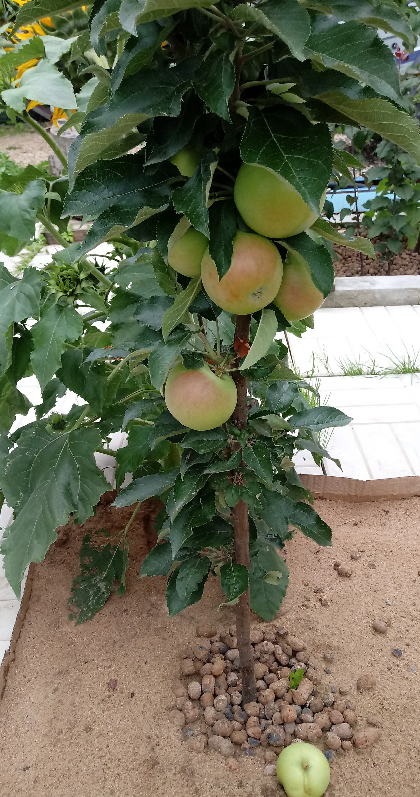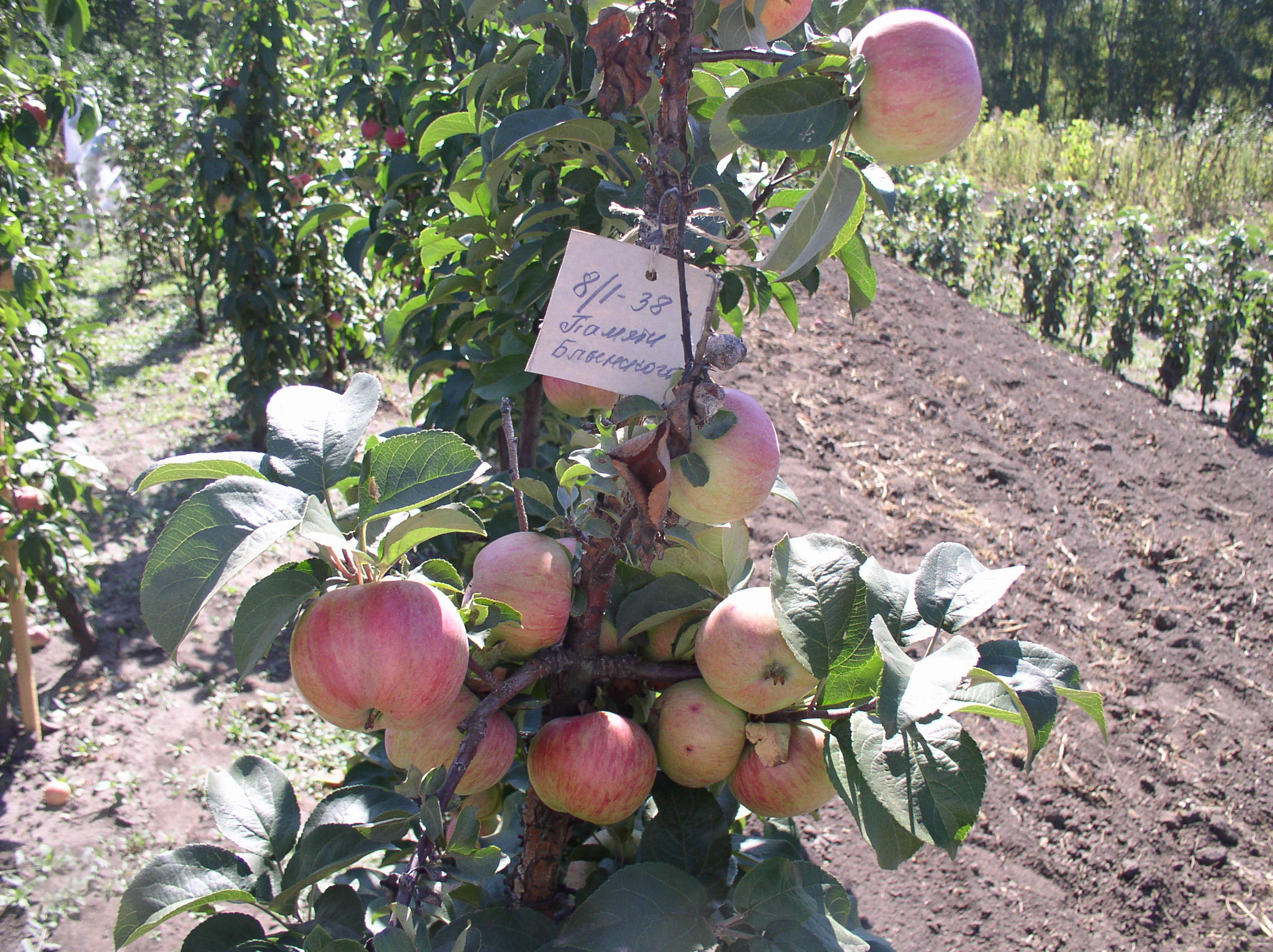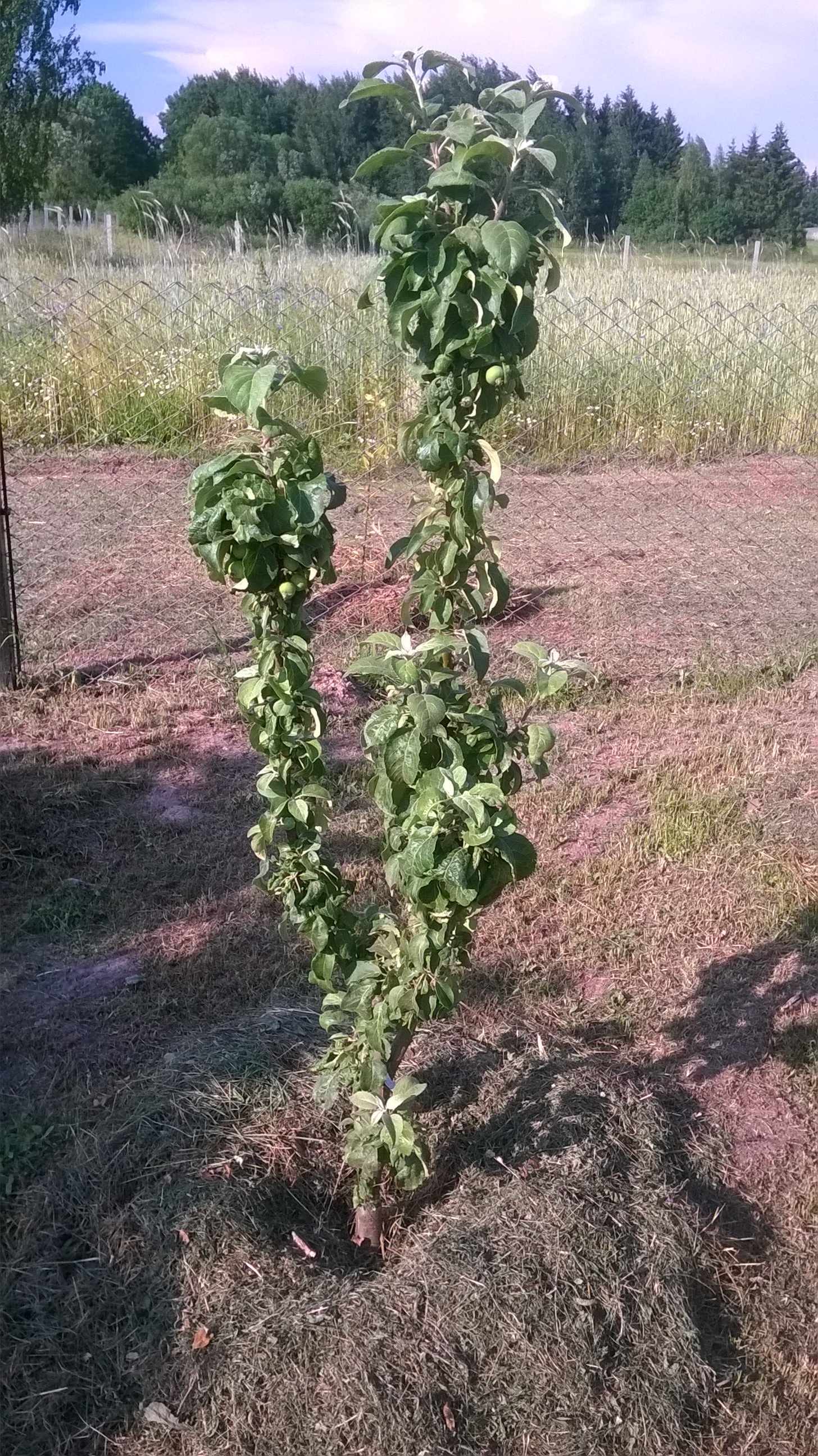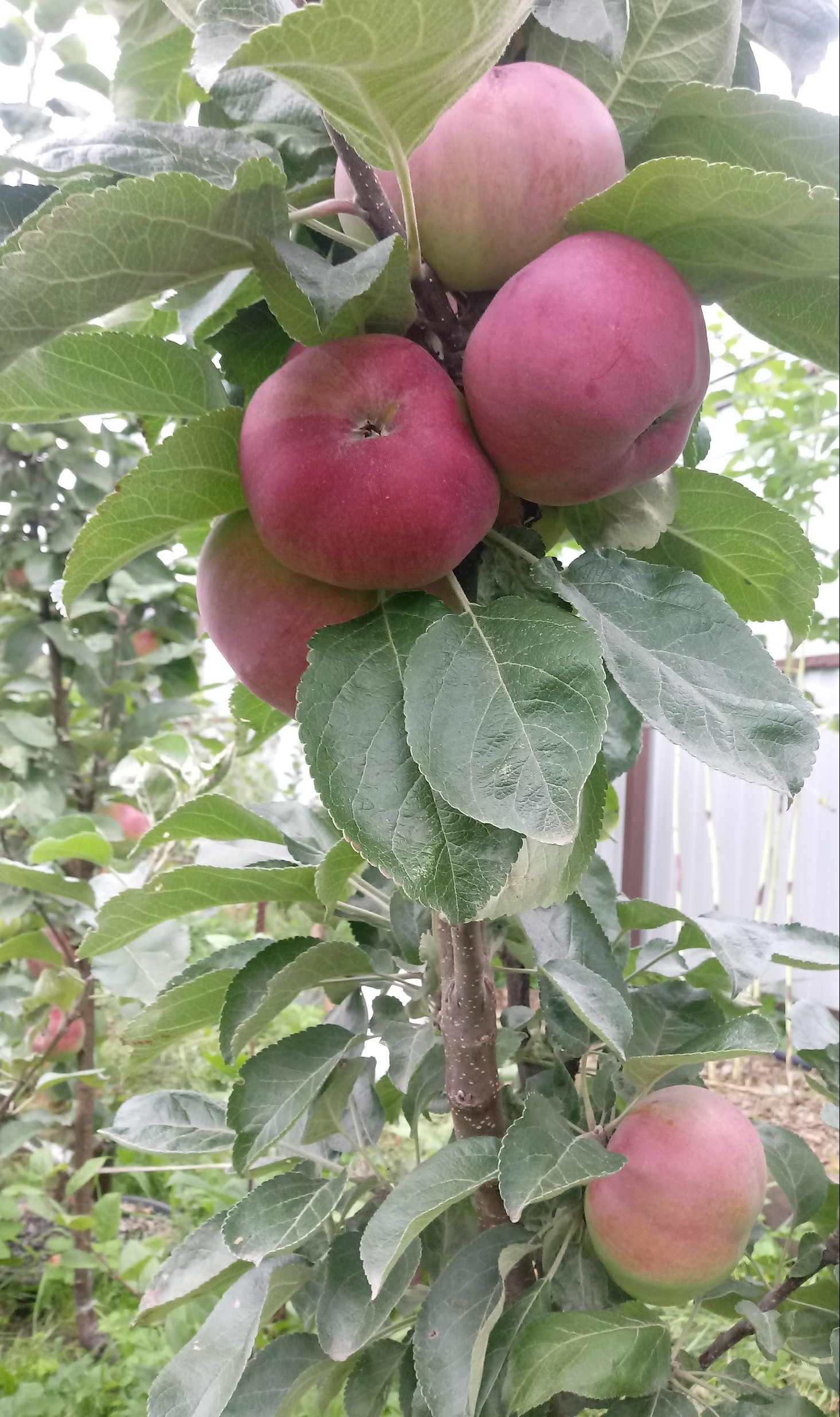 Весной 2016 г. на ММ 106 привил гибрид колонны 61-29 (черенок от Коршунова). Первый раз эта колонна дала яблоки. Фото конца июля, яблоки практически не подросли, но стали темнее.