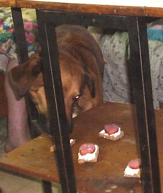 Даю псу взятку в виде бутербродов со сметаной и колбасой (он их обычно ест в три этапа , сначала двумя зубами снимает колбаску