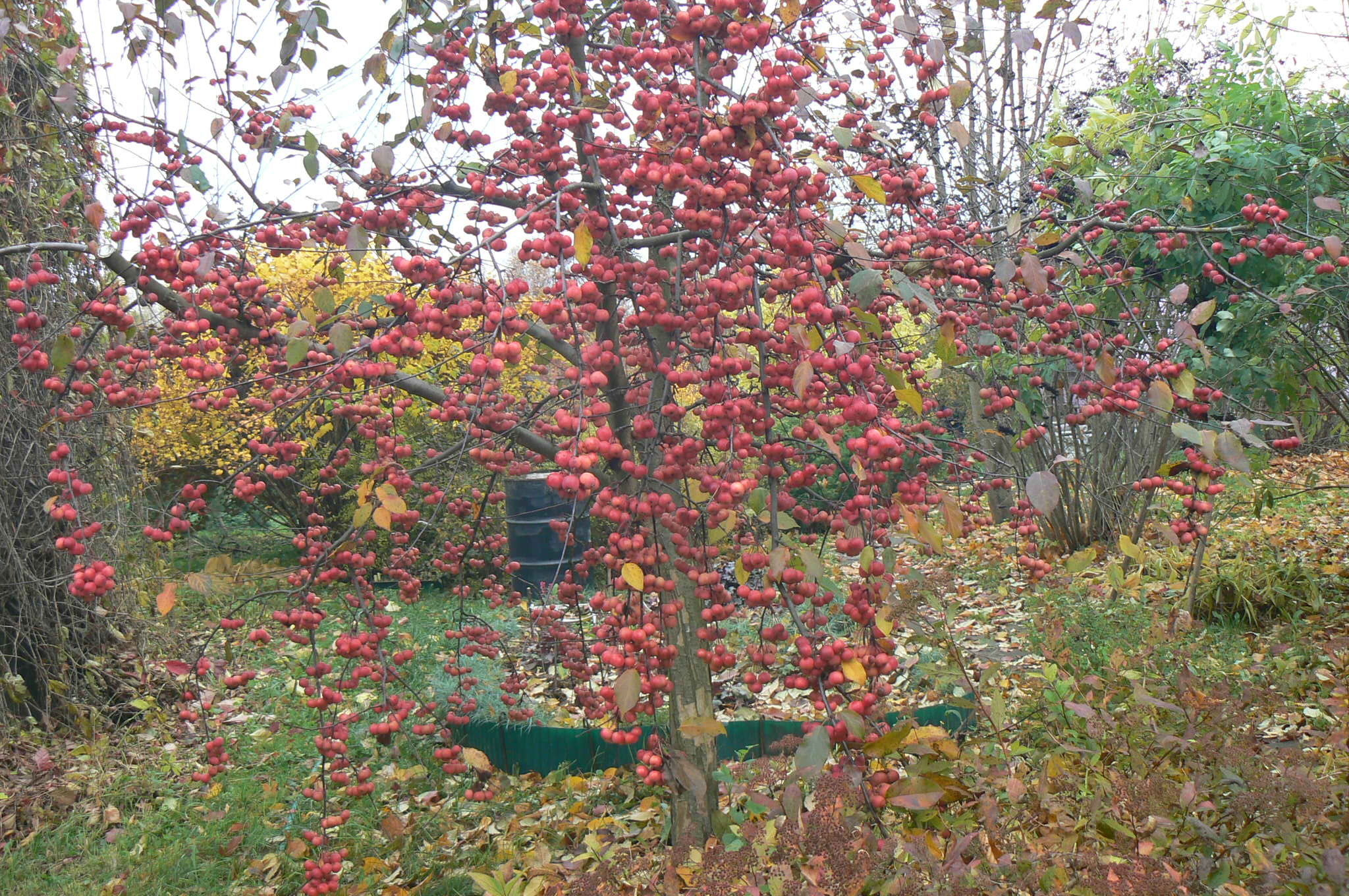 Поэтому подозреваю, что у нас - не сорт, а видовая Недзвецкого. Но всё-равно, красивая.Такая. Осенью листва не желтеет, яблочки сами осыпаются. сейчас такая. Обмазанная глиной.