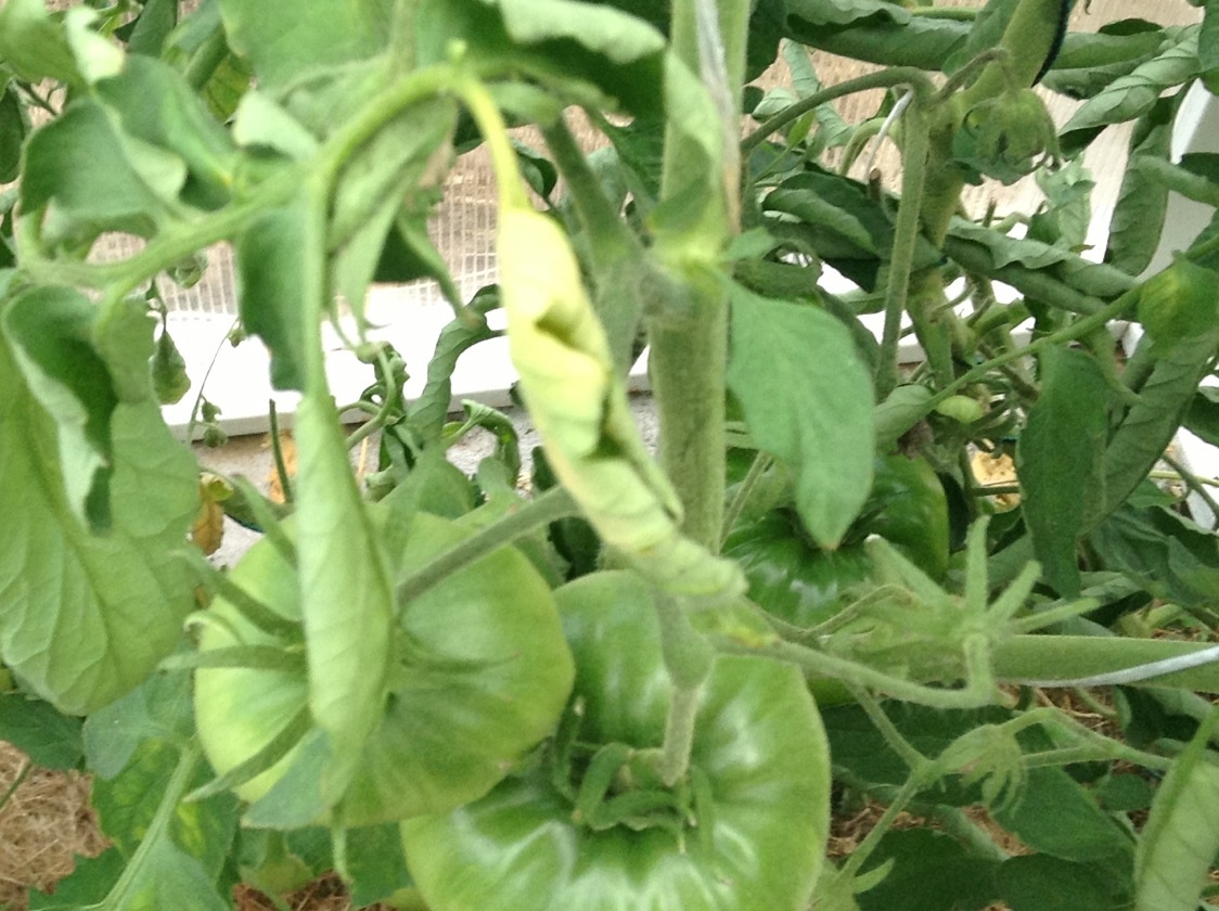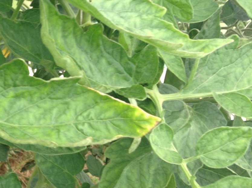 это меня смущает, т.к. здесь типичная "калийная" кайма. Интересно, что кайма в основном на кончике листа, а к черешку она менее выражена. Я бы комплексным с микроэлементами подкормила, что надо томат сам возьмет.