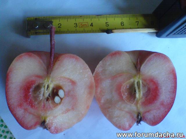 Однако, иногда, даже если произошло переопыление с краснолистными (антоциановыми) ранетками, то не всегда в сеянцах появляются краснолистные ГФ? Как это определил? Иногда, некоторые обычные сорта, при переопылении с антоциановыми формами яблони, дают плоды с окрашенной мякотью, если в из родословной, один из предков был антоциановым. И это хорошо видно, когда часть плодов таких сортов имеет обычную мякоть, а часть плодов- окрашенную, если цветы опылялись пыльцой антоциановых ранеток или такими формами яблони с красномякотными плодами. Вот пример: