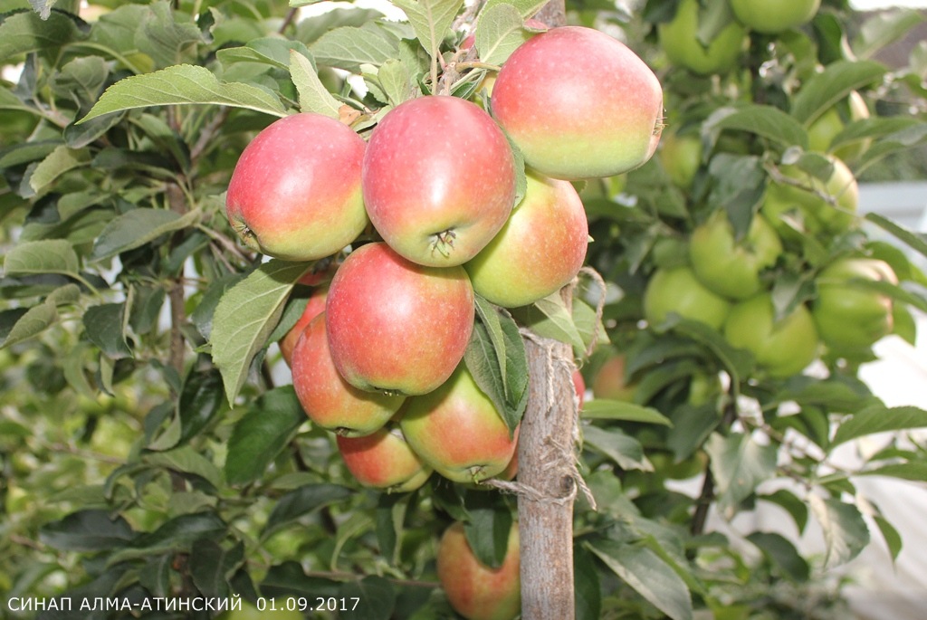 В этом году первый раз плодоносил Синап Алма-Атинский, сорт привит уже давно, но с плодами как то не получалось и вот только на днях я смог его заценить. Сожалею, но фото плодов при съёме не сделал, была плохая погода, вот есть предварительная фото на 1 сентября, плоды удачно провисели ещё больше месяца, набрали объём и полностью окрасились в рубиновый цвет. Мякоть плотная сочная, скалывающаяся, сладкий конфетный отличный вкус, оригинальная форма и окрас плодов. На хранение не успел заложить, все сразу съели.