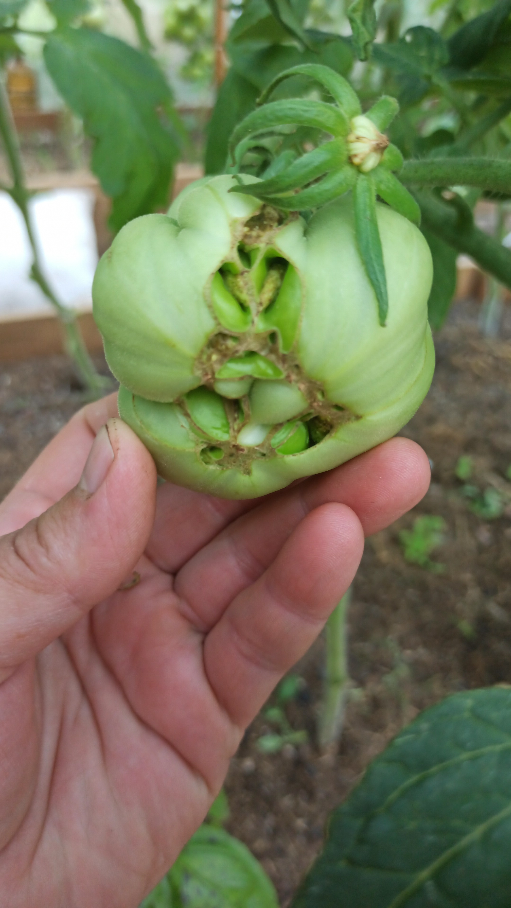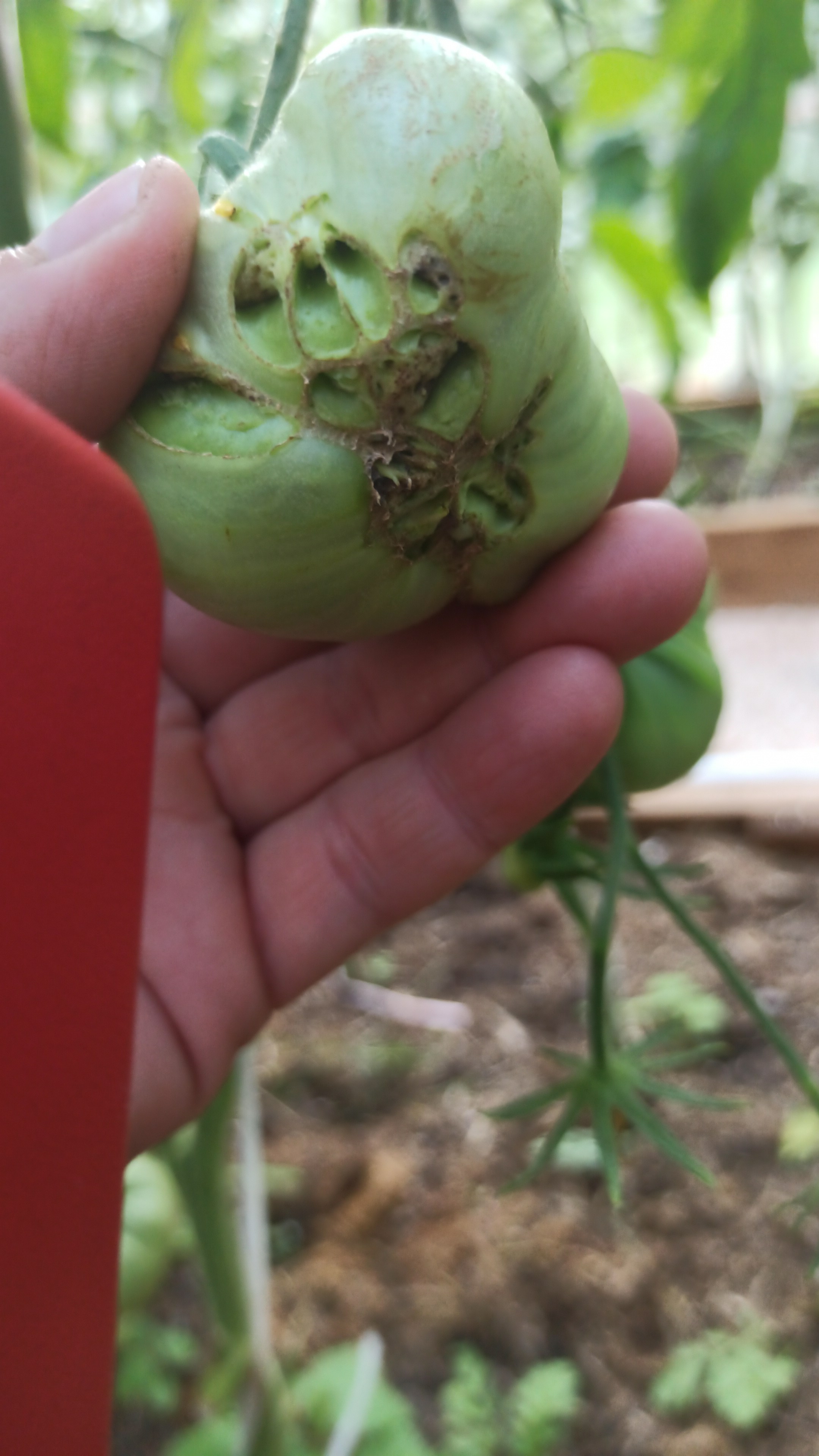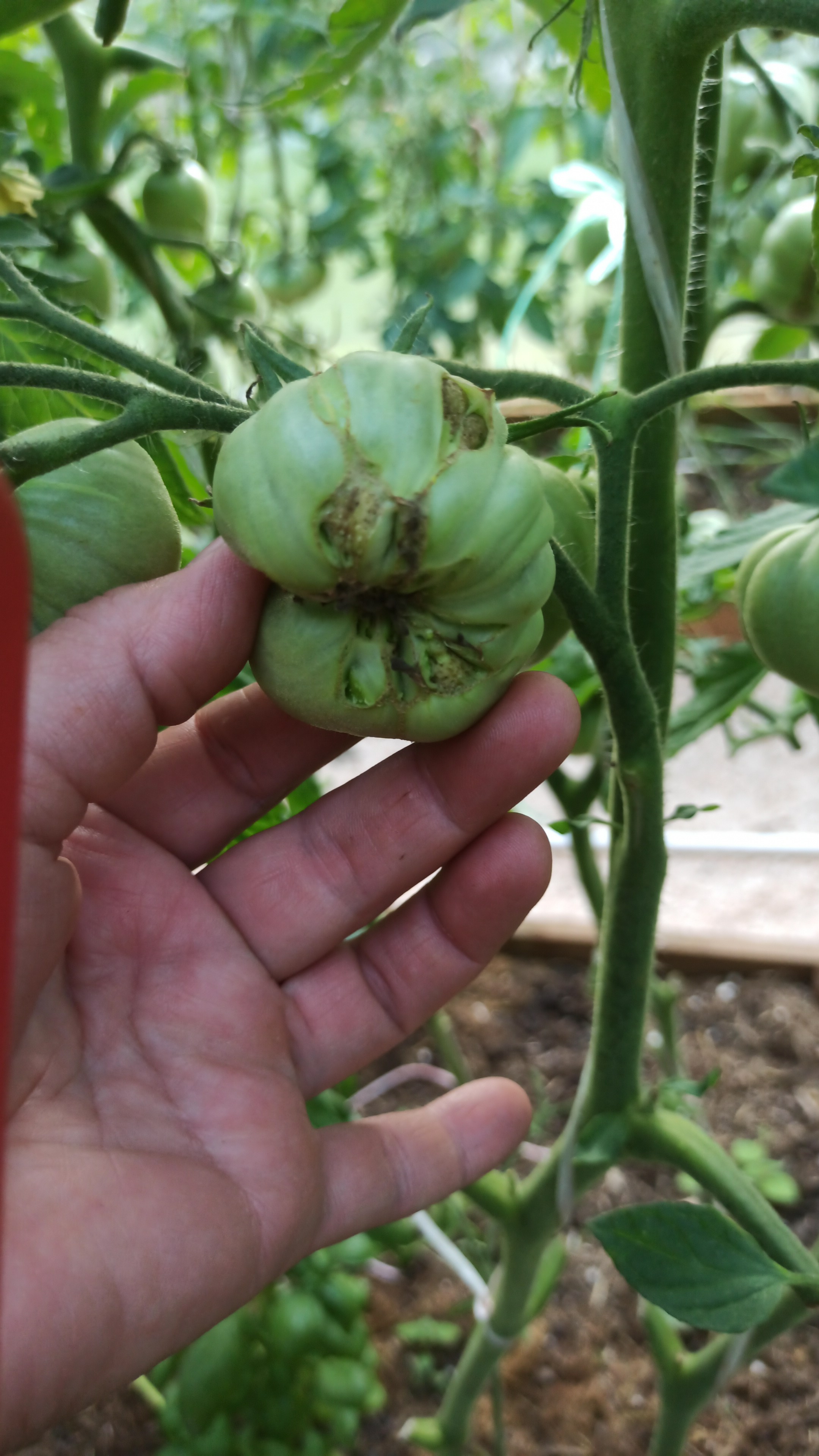 Нет, термин к.морда не мой. Это определение взято мною из источника Мир томата глазами фитопатолога. А.К. Ахатов. Но там это определение (с фото) связывалось с другим видом нарушения-растрескивание плода по вершине с обнажением семян,по причине избытка аммиачного азота. Но в других источниках этот термин к. морда связывают просто с уродливой формой плодов. В данном случае по приведенным фото речь идет о деформации(разной степени) плодов. Тут причины другие. Ниже я приведу фото сильной деформации (нижнее фото)и деформации с сухими некрозами(на верхнем фото слева). Все эти уродливые формы связываются с влиянием гормональных явлений в самом растении,которые индуцируются в основном факторами внешней среды или технологическими приемами. В данном случае применения регуляторов плодообразования. Если воздействие слишком сильное , то возможно травмирование и возникновение новых меристем. В результате получаются различные уродства плодов-израстание плодолистиков,фасциация и т.д. Считается, что в случае сильной деформации плодов-причины в оставлении фацированных цветков на растении, значительные колебания суточной Т в период цветения и плодообразования, применения больших доз стимуляторов плодообразования. Во втором случае(деформации с сухими некрозами) причины-низкие Т и сильные суточные разницы Т после завязывания плодов,отсутствие оптимальных условий (Т и освещение) в период цветения, большая восприимчивость к данному явлению крупноплодных сортов.