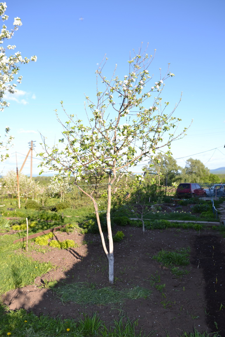 На фото плохо видно, что яблоня цветет. Добавлю снимок с другого ракурса.