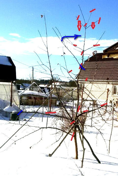 Сейчас меня беспокоит хилый стволик при длинных скелетных ветвях нижнего яруса, посмотрите, пжт, вторую фотографию в моем первом посте на тему. Там хорошо видно. Не нужно их укоротить? Да и высоту дерева я бы снизила (кажется называется перевод на боковое ветвление), уж очень макушка тощая. Вот синим, взгляните, пожалуйста:
