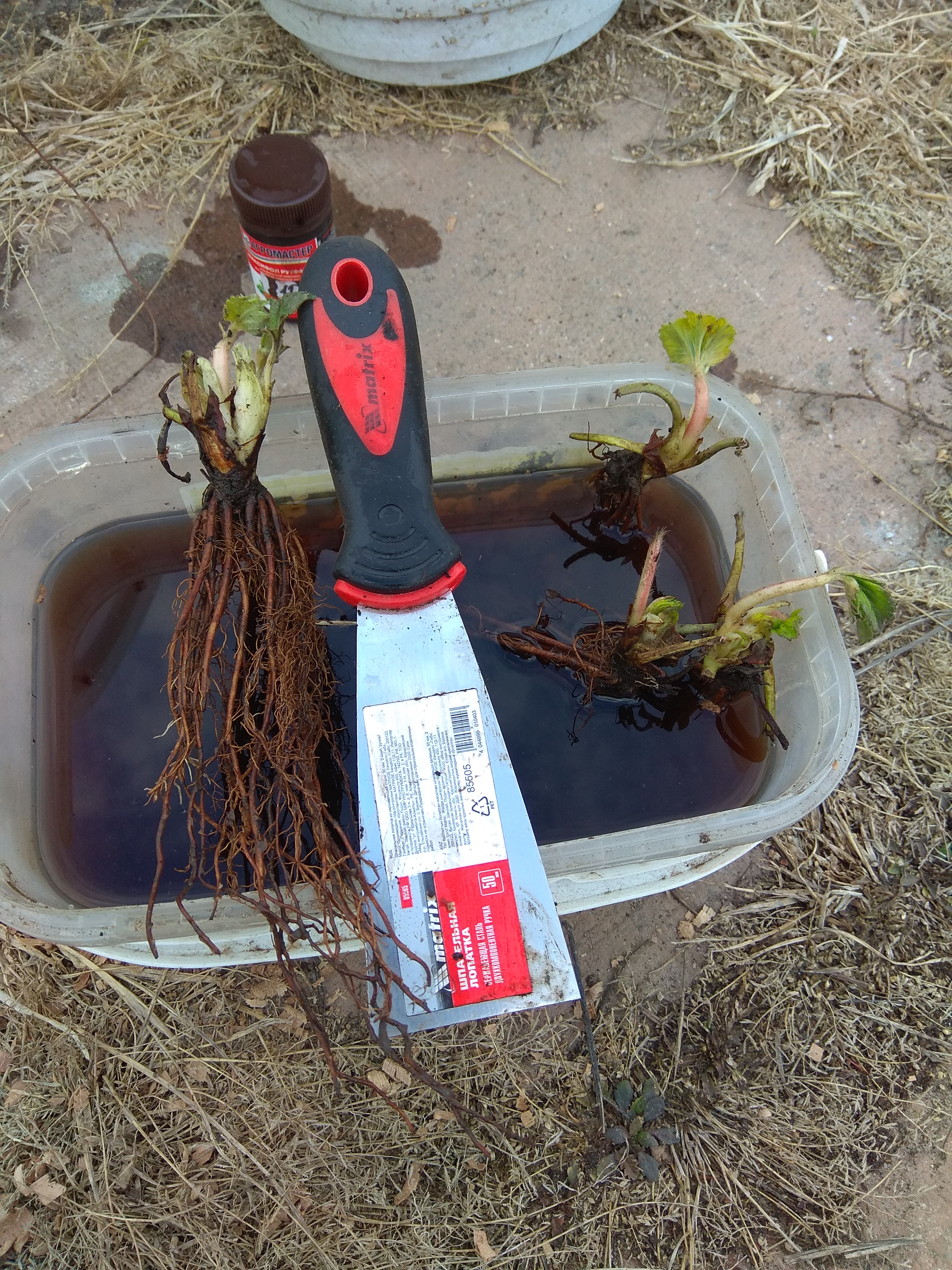 Сегодня утром один (наиболее желтый) из трёх саженцев Царицы выкопала и освободила нижнюю половину корешков от грунта. Посадила с расправленными корнями в это же место. До понедельника уезжаю. Надеюсь, она пойдёт на поправку.