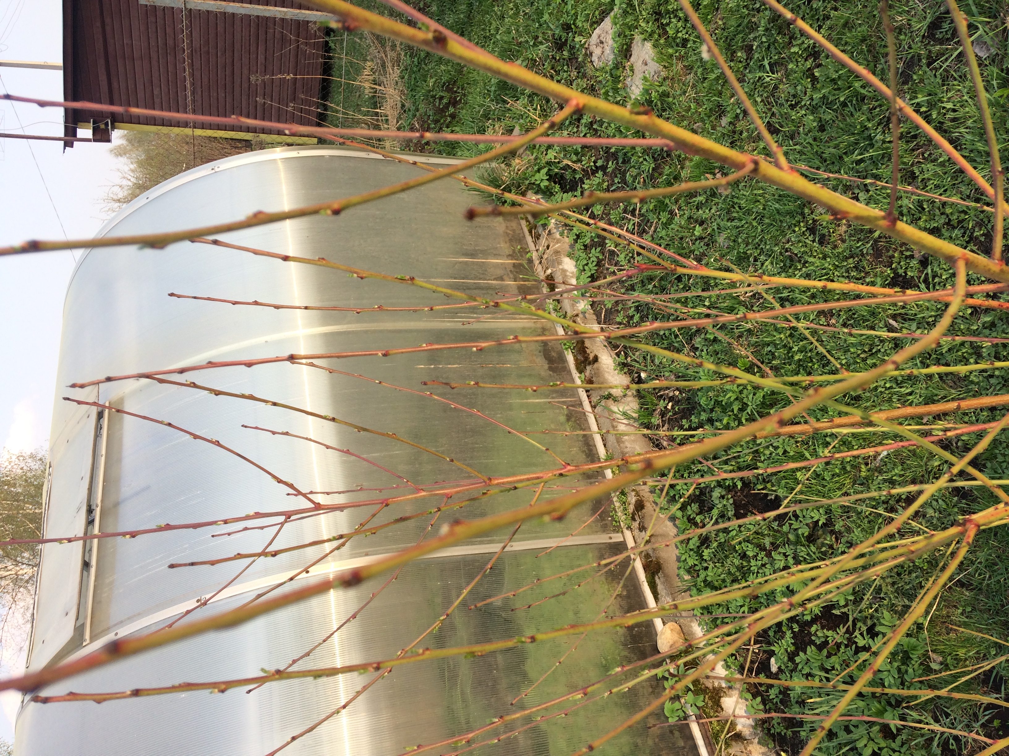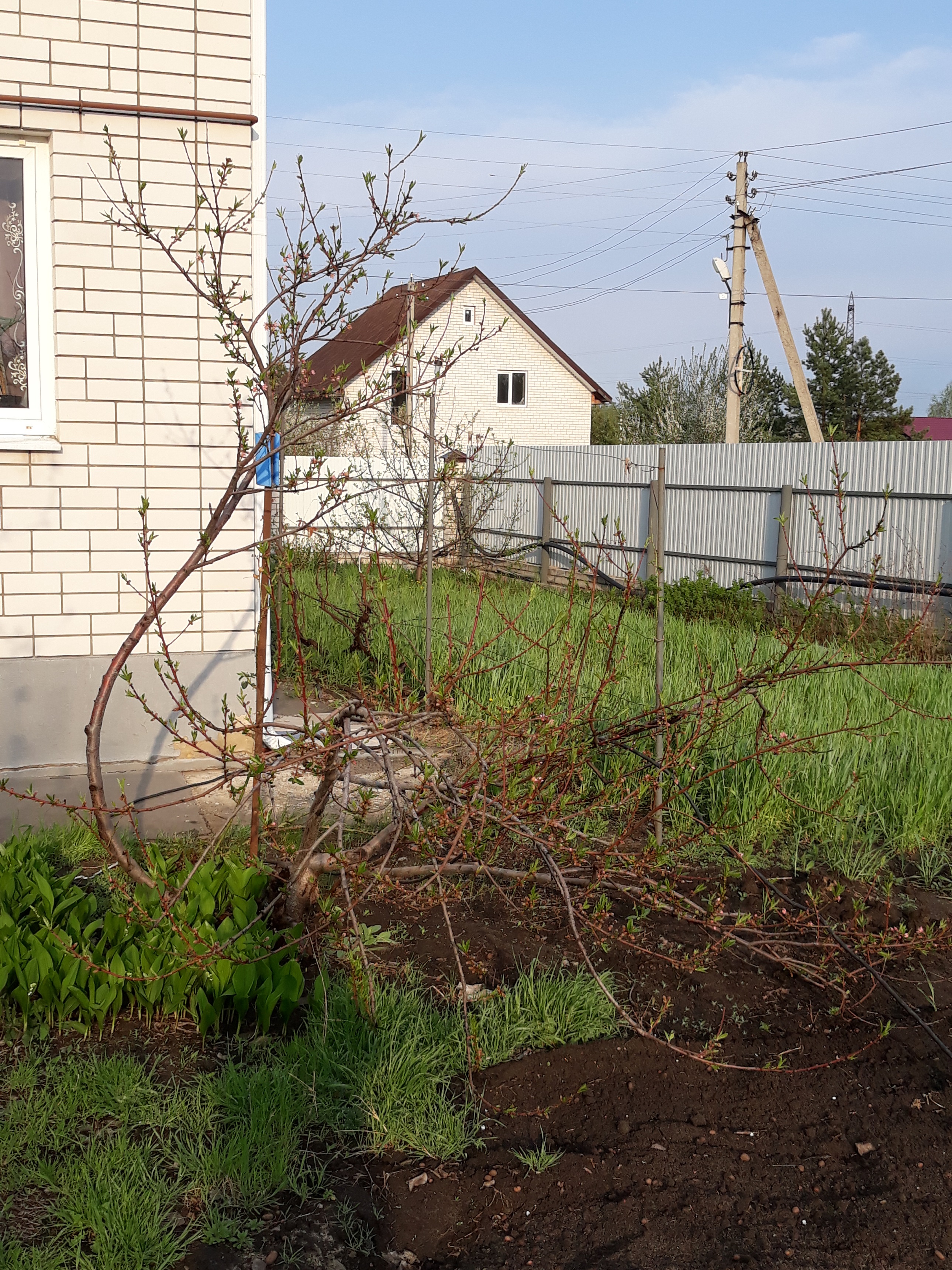 В прошлом году посадил персик от Голубева. Лёгкое укрытие у южной стены... Восемь почти распустившихся бутонов на данный момент, небольшие листья. Несколько цветочных почек замёрзли после последних ночных заморозков в 1-2 градуса: видно, надо держать лёгкое укрытие до начала распускания почек.