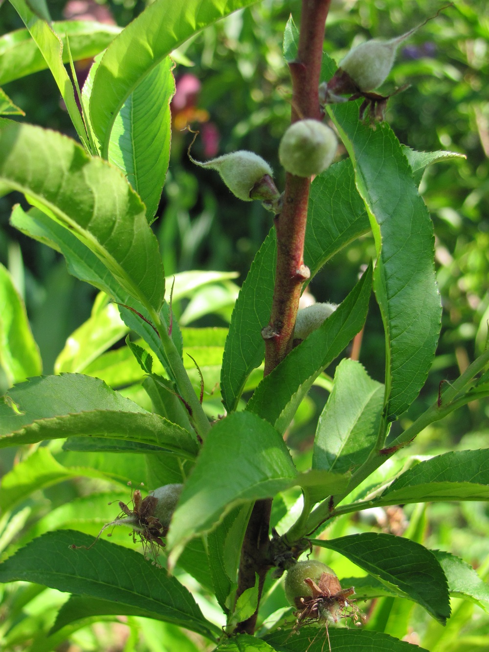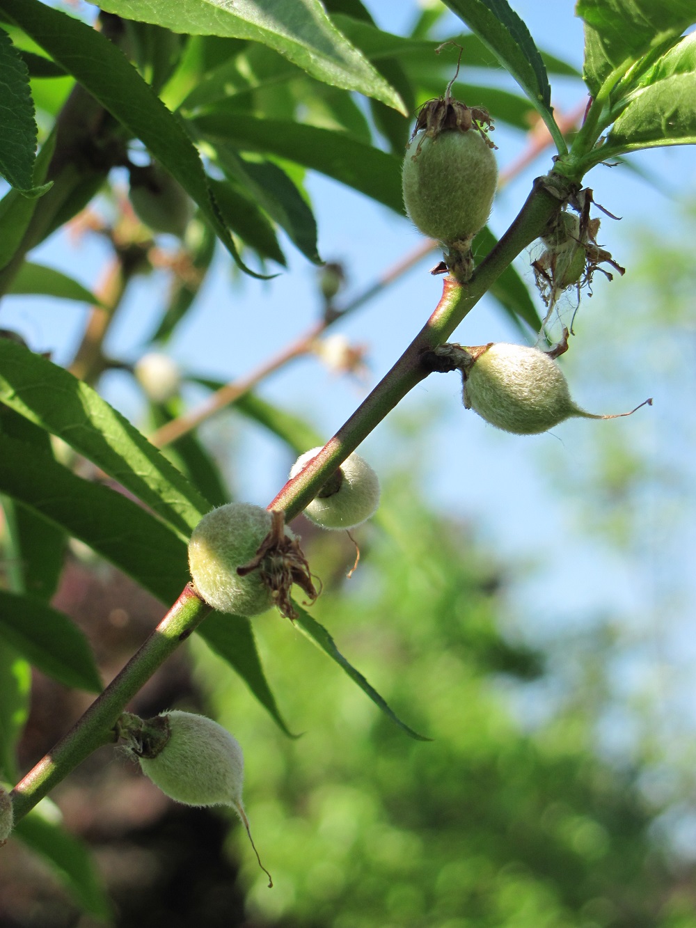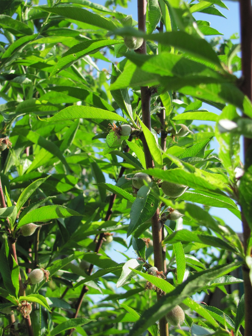 В теплице у меня растёт один персик,но на нём плоды не завязались. Предполагаю, что им очень жарко было в период цветения.