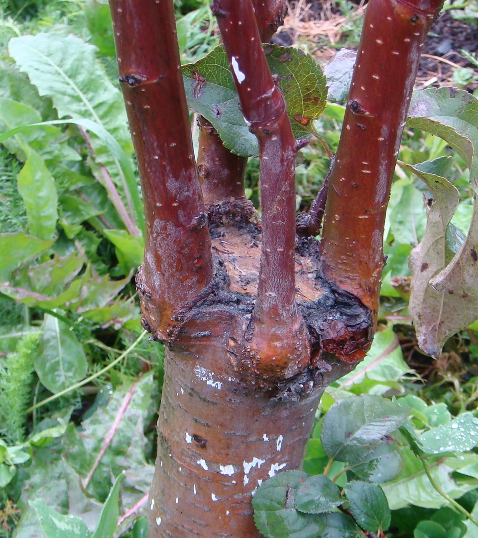 Встает вопрос - куда лучше прививать? Ствол толстый, но кора еще эластичная, без растрескиваний. После разветвления диаметр скелетных ветвей около 10-15 см (по памяти, в выходные не догадалась замерить).