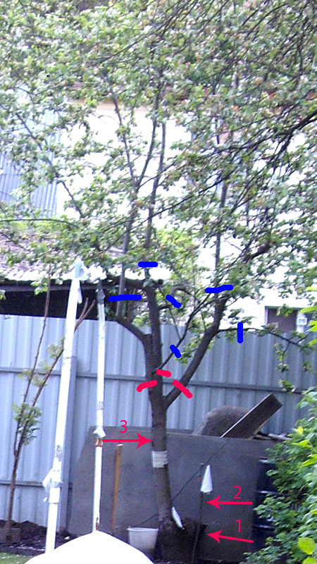 Второй вариант, который приходит мне в голову - по синим линиям. Для меня он менее предпочтителен, т.к. прививать придется на высоте более 2-х метров да и сформированная ранее крона меня не очень устраивает.
