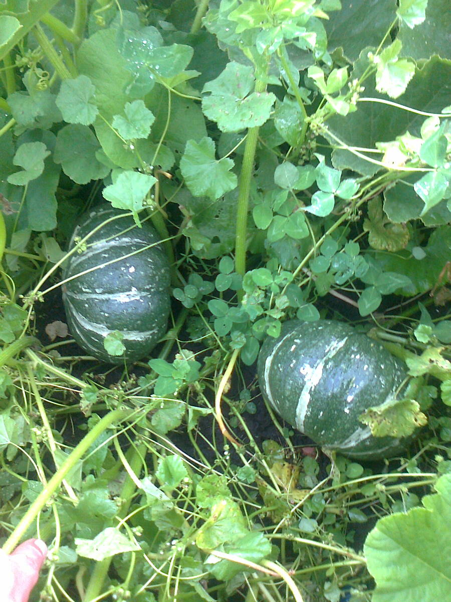 А это на сегодня у меня две такие тыквы выросли из СЗ этого года. название не помню. Сажала первый раз поэтому ничего не могу сказать про вкус и т.д.