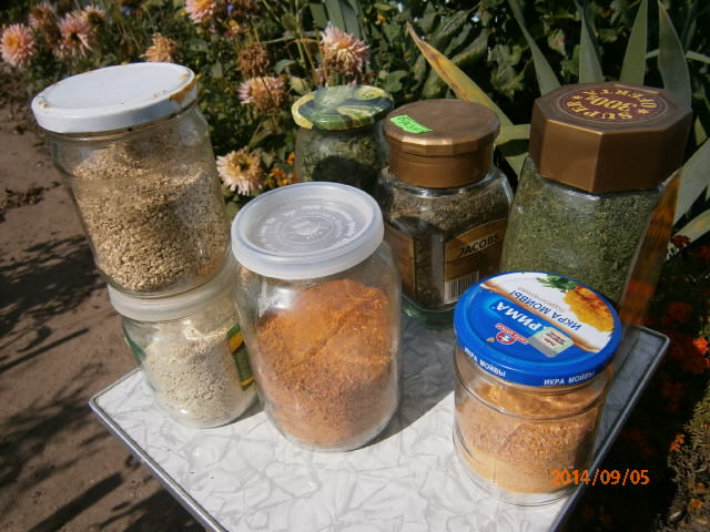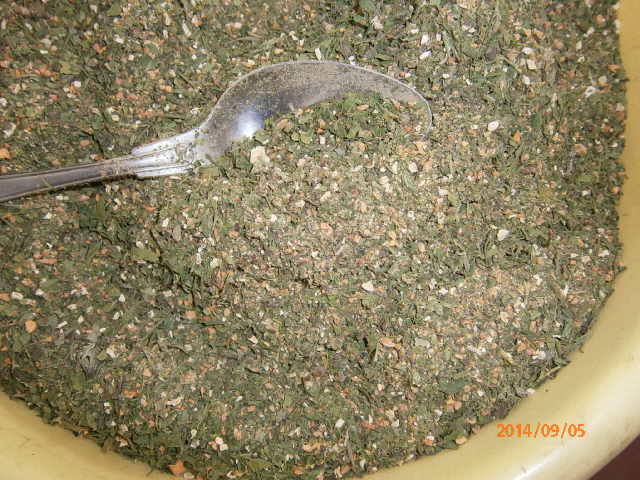 Хочу предложить рецепт домашней сухой приправы по типу «Роллтон»,»Ароматика» и др.Берём зелень укропа,сушим в электросушилке,перетираем между двумя ладонями до порошкообразного состояния.Тоже самое делаем с зеленью петрушки,сельдерея,любистока и базилика.Потом берём белые корни-у меня это корневая петрушка,корневой сельдерей,пастернак и морковь.Режем на тонкие ломтики,можно пропустить через мясорубку,чтобы не резать.Сушим.Пропускаем через кофемолку.Получаем порошок.Смешиваем всё.Получается приправа ароматная без усилителя вкуса и запаха,без разных «Е» добавок,без сои.Чтоб не заводилась моль,можно дать немного мелкой соли.Я делаю без соли,храню на кухне в шкафчике под крышкой