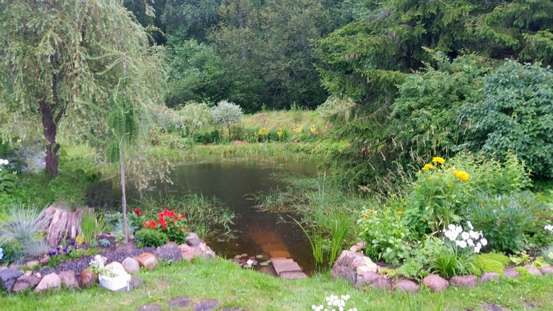Вот мой водоёмчик с тростником, справа за клумбой... Может и я приду к выводу, что нужны высокие травы... кто ж нас, женщин, знает...