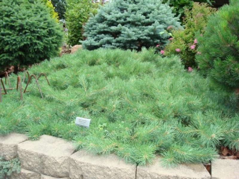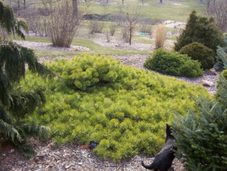 Очень интересный сорт горной сосны нашла (сядет в правую сторону вместо гортензии). У нее молочный цвет молодой хвои, потом зеленеет.