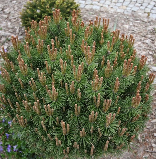 Рост -медленный. Побеги -вертикальные, с густой, плотной, короткой, жесткой, зеленой хвоей, иглы собраны в пучки по две, с кремово-белыми молодыми приростами.