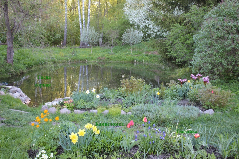 А Ирисы (я отдаю предпочтение сибирским - совершенно малоуходные, и сортов сейчас полно и по цвету, и по срокам цветения) на берегу прекрасно будут смотреться.