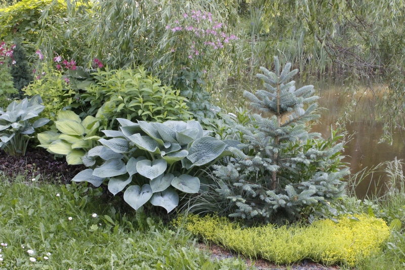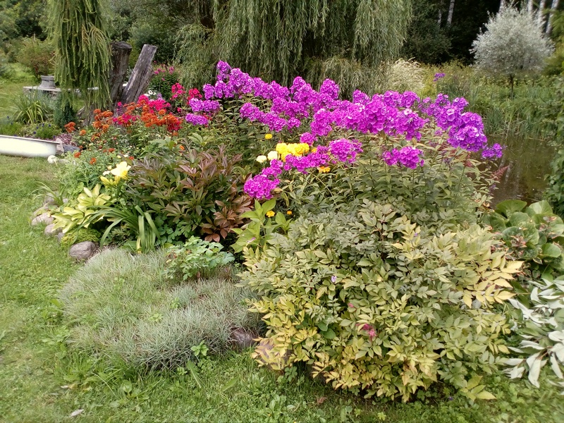 Лук декоративный и шалфей рядом растёт, фундук краснолистный есть, но он растёт огроменным деревом (можно кустом), скумпия тоже не мелкая... не понимаю, куда их? У меня не засаженными остались только дальние берега. Справа растут огромные ели, перед ними барбарис и сирень - тоже уже большие кусты, я их ничем заслонять не хочу. На клумбе справа подрастает туя Смарагд, перед ней пион, рядом бадан и астильба, гвоздика седая и камнеломка. Левее растёт сосна горная. Когда вырастут туя и сосна, многое уберётся. Временно там флоксы, хризантемы. Их не будет.