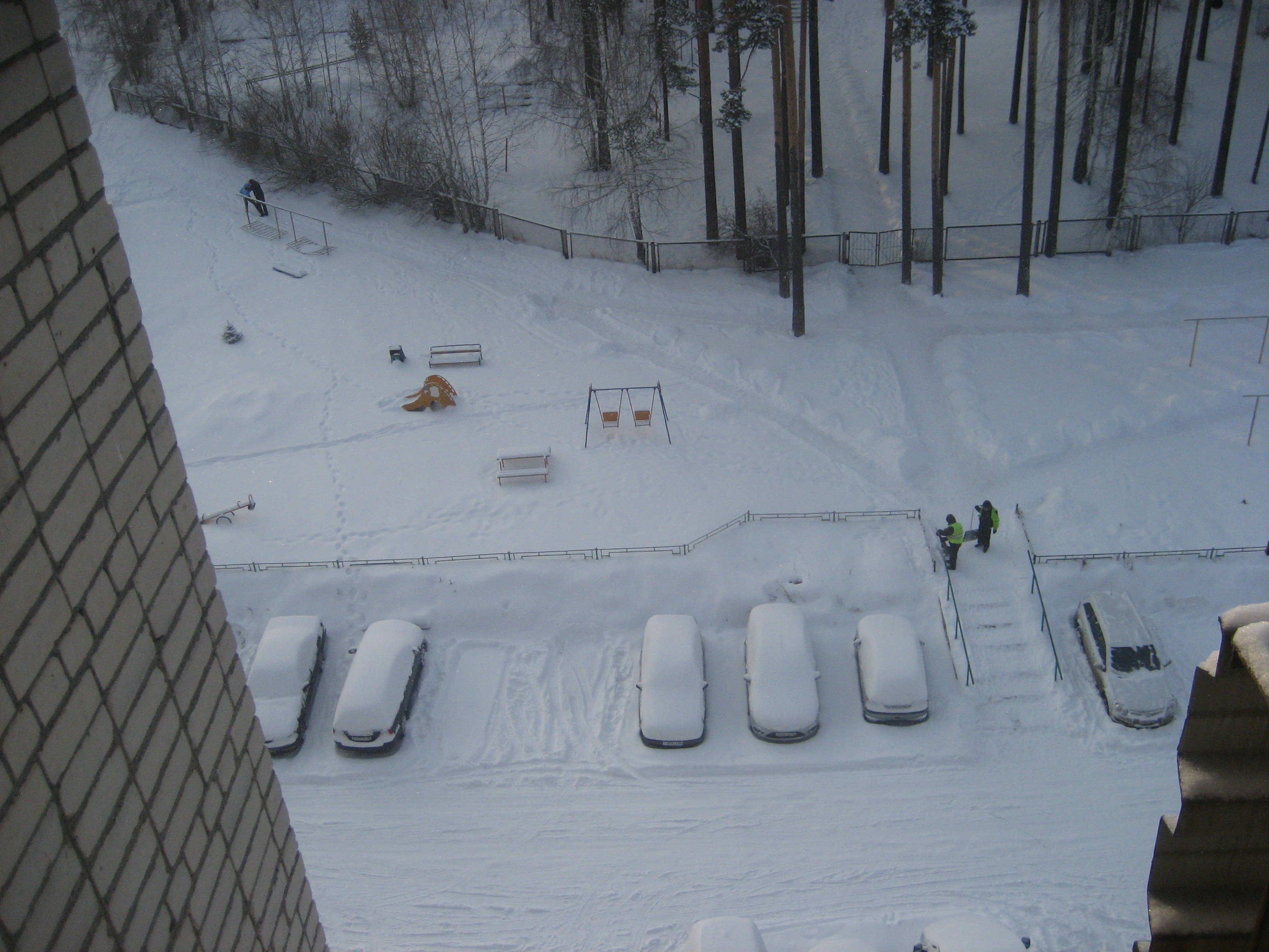 Бедные, впервые за всю зиму им снег убирать пришлось, до этого только соль с сухого асфальта метлой сметали. Немножко похолодало, на ночь -26. Хоть бы еще такая зима постояла...