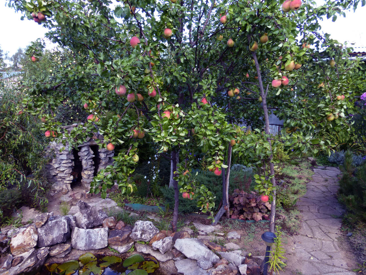 Груша Мраморная в Тульской области. Для предохранения ветвей от поломок здесь используются чаталы, но за листвой можно разглядеть толстые и прочные ветви. Именно этот типаж я и предлагал для грушевых скелетов. Созревает в первой декаде сентября. Черенок с этого дерева привил в крону Велесы весной 2015-го года. В моих условиях созревает в третьей декаде, хранится в холоде не менее двух месяцев.