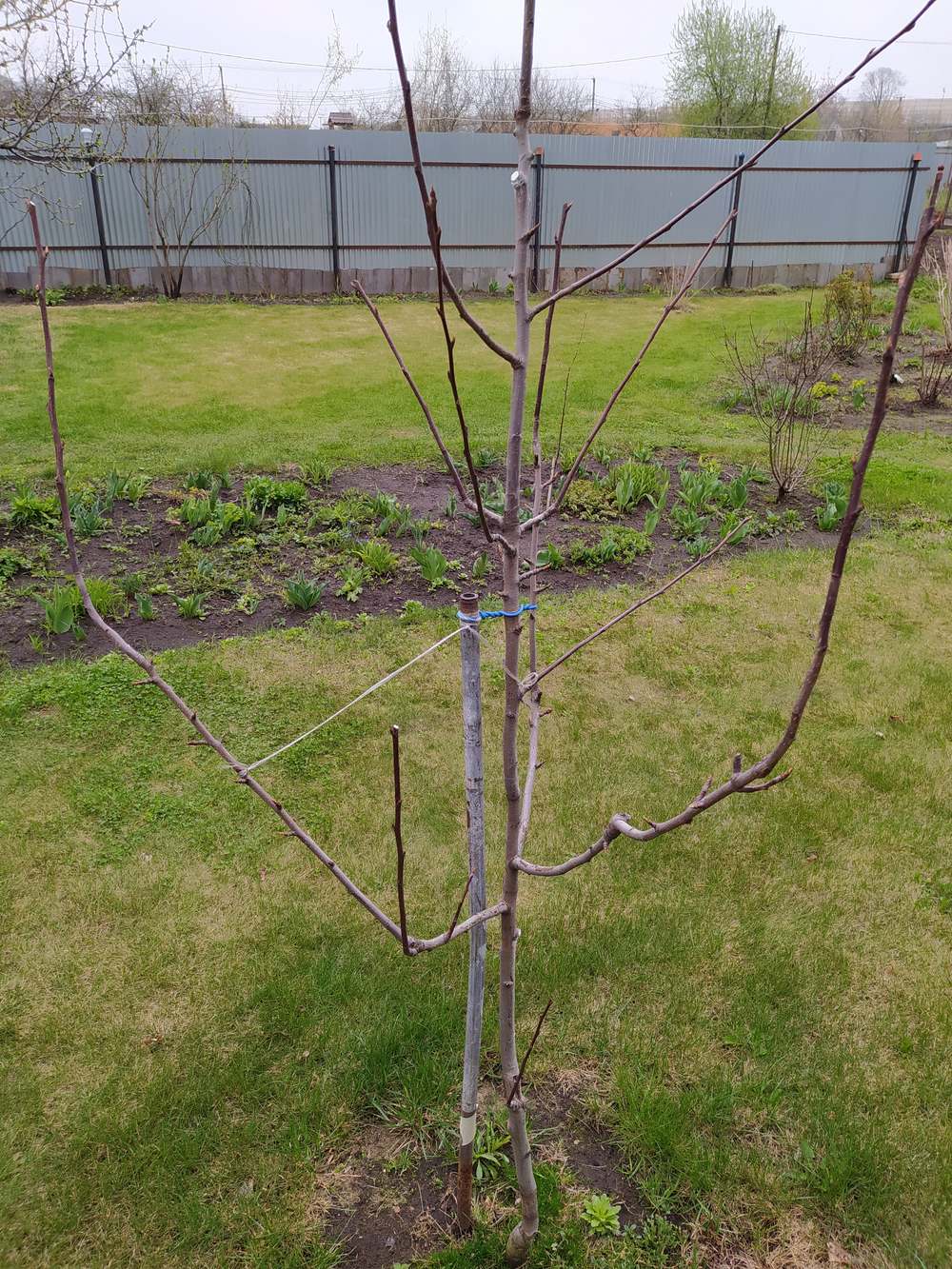 Справа хлыст с одной боковой веткой и синей биркой,сейчас эта палках в цветах.Левее высокая Дево,плодух нет,за ней несколько Талгарок,расцвели.Подвой у всех ВА29.