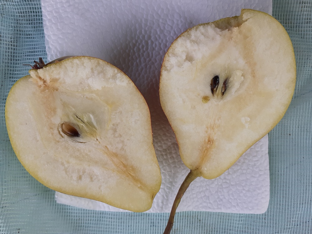 Продолжу про Мраморную. Позавчера чуть пошевелил одну из груш на ветке и она оказалась на ладони. На ощупь довольно твердая, но плодоножки отрываются без усилия. Сегодня провел вскрытие. Мякоть еще немного мучнистая, но сочная. Семечки только начинают темнеть. Сахаров маловато, но вполне съедобна. Думаю еще минимум недельку груши должны повисеть.