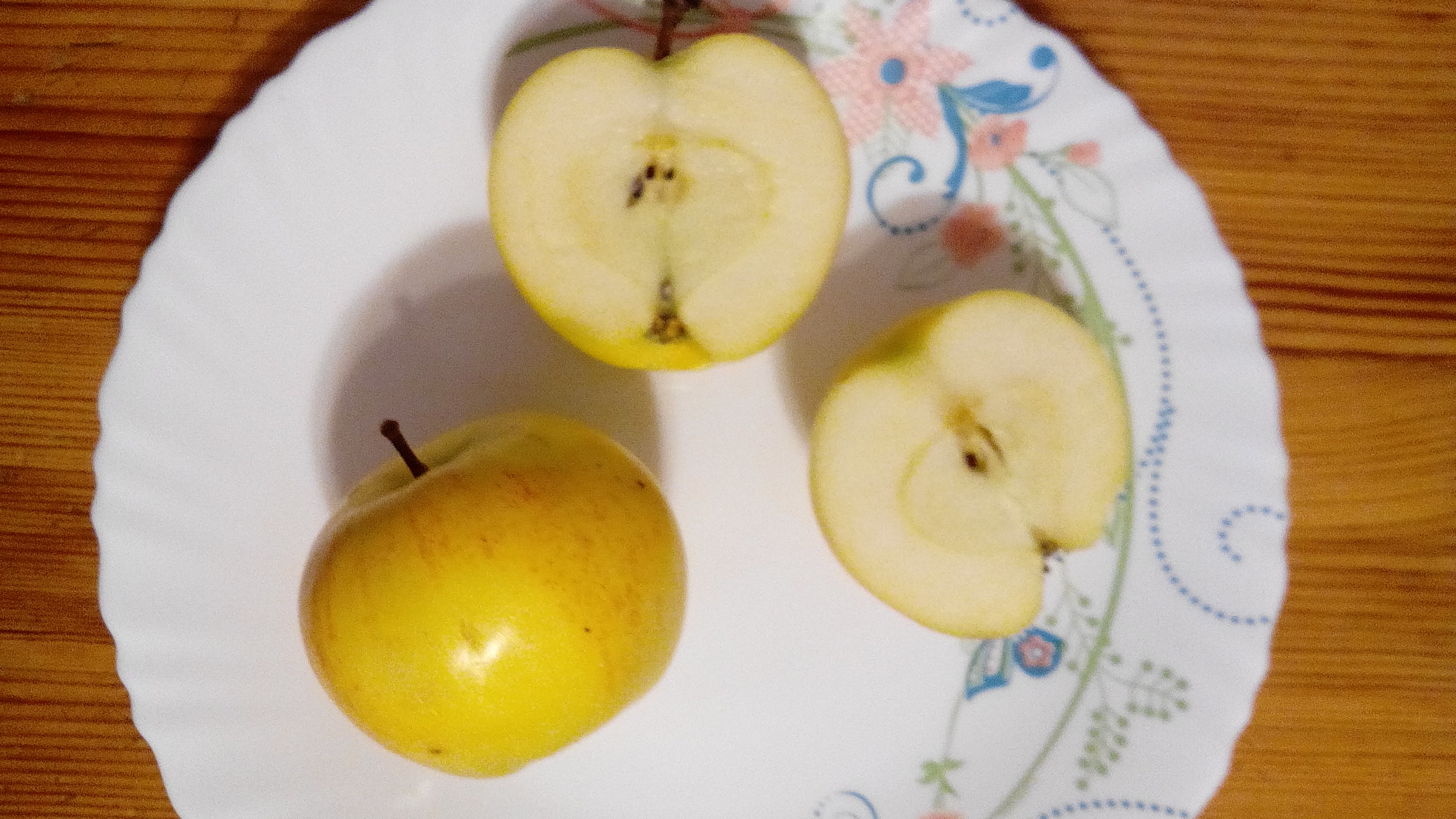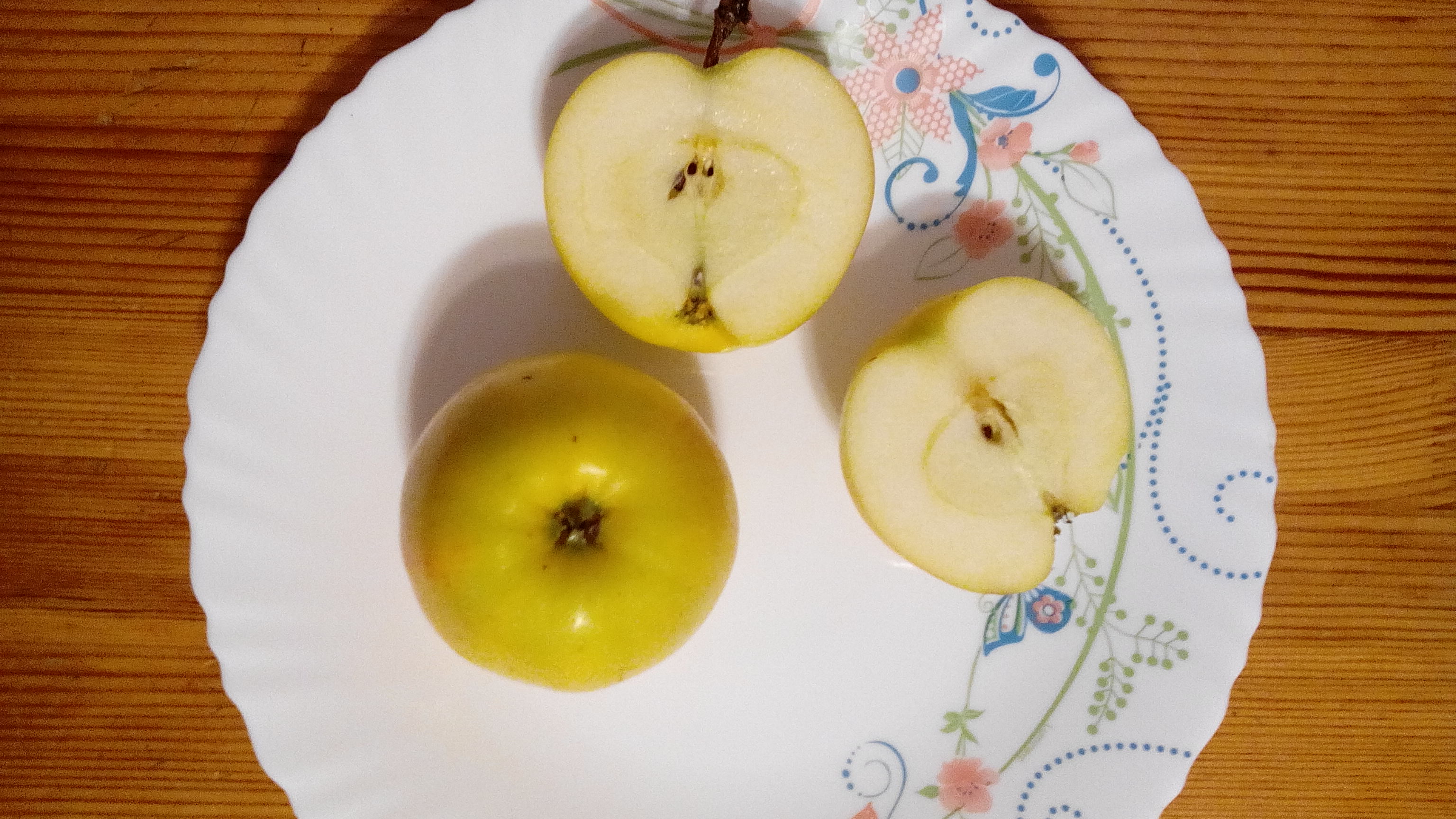 Борис, я наверное не желая того, создал иллюзию, сфотографировав Хидден Роуз на фоне другого сорта. Хотелось, чтобы на срез яблока падал естественный свет из окна, расположение должно было быть перпендикулярно свету, облокотил на попавшееся под руку яблоко Лигол (на заднем плане). Форма немного удлинённая - это заметно, плоды второй год такой формы. Основной окрас был зелёный с желтым румянцем, но в хранении интенсивность окраса мякоти изменилась и думаю начала больше просвечивать кожица, на срезе видно, что сама кожица желтая.