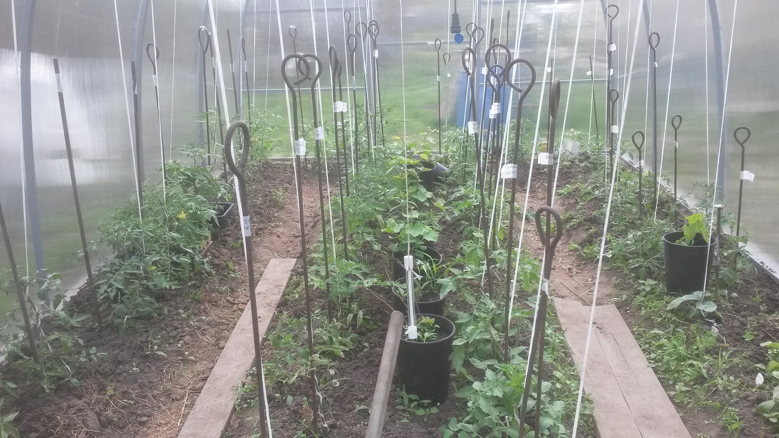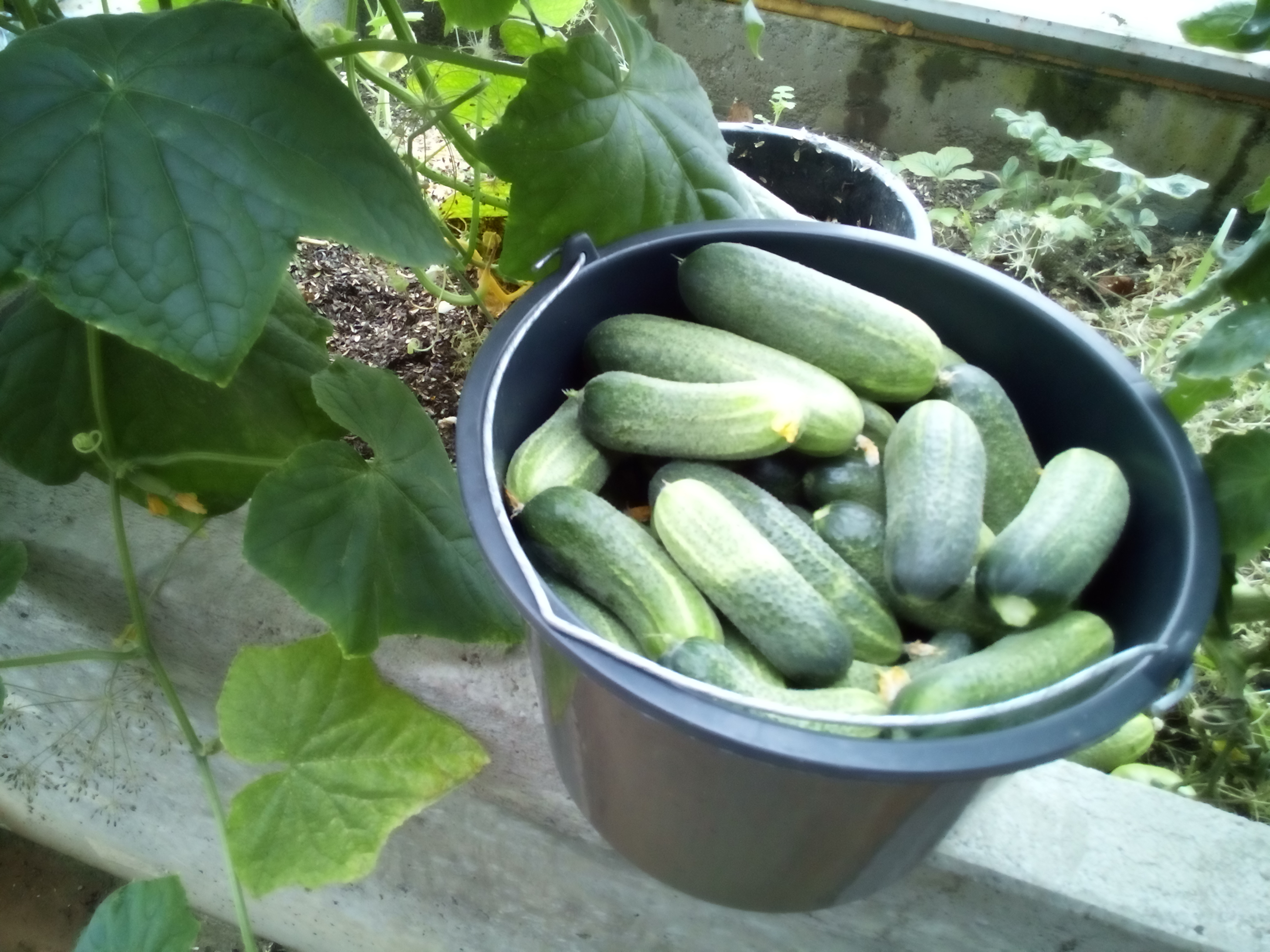 У меня в теплице примерно 20 тонн бетона, 2200 литров воды. Двойное остекление. Это позволило в апреле без потерь пережить 2 недели минуса на улице. Минимум на улице было -10 ночью. В теплице минимум было +8 градусов. Первые огурцы были получены в начале июня. Их вырастил без рассады, сразу в грядку. Первые помидоры созрели 20 июня. Огурцы уже ведро засолили, с 4-ёх растений.