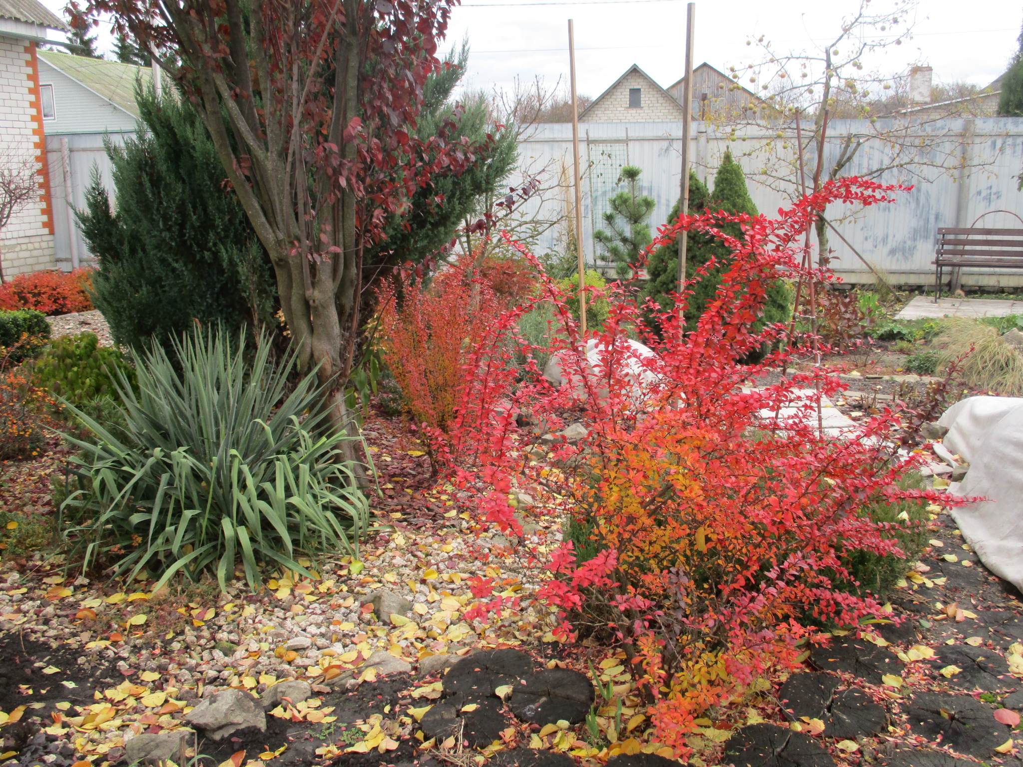 Вот раньше не могла понять, зачем высаживать на участке барбарисы... они ведь колючие. А теперь от них просто в восторге - такие красивущие. И листики долго не опадают. Вдалеке тоже барбарисик краснеется? И юкка у тебя красивая, не то, что моя лохмушка была. Или это не она перед можжевельником? Цветёт? И без цветов она выглядит очень декоративно.