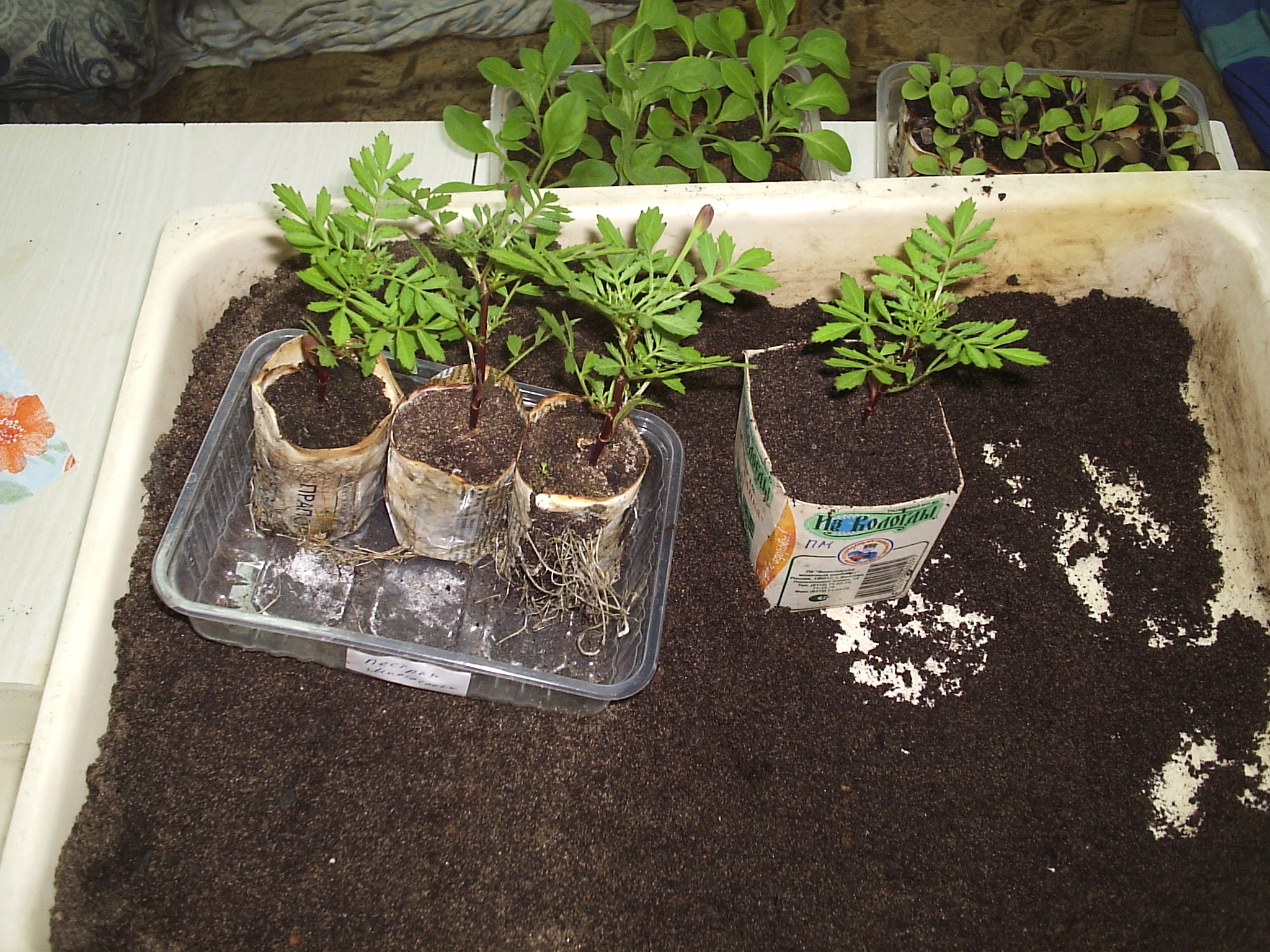 Основная же масса бархатцев еще в школках , и только с семядольным листом