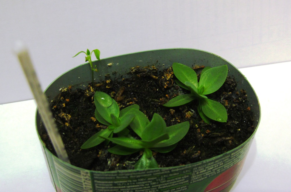 Три ростка мелиссы были посажены в цветочный горшок - места там у них больше. За 10 дней они стали заметно больше тех, что в бумажных стаканчиках.