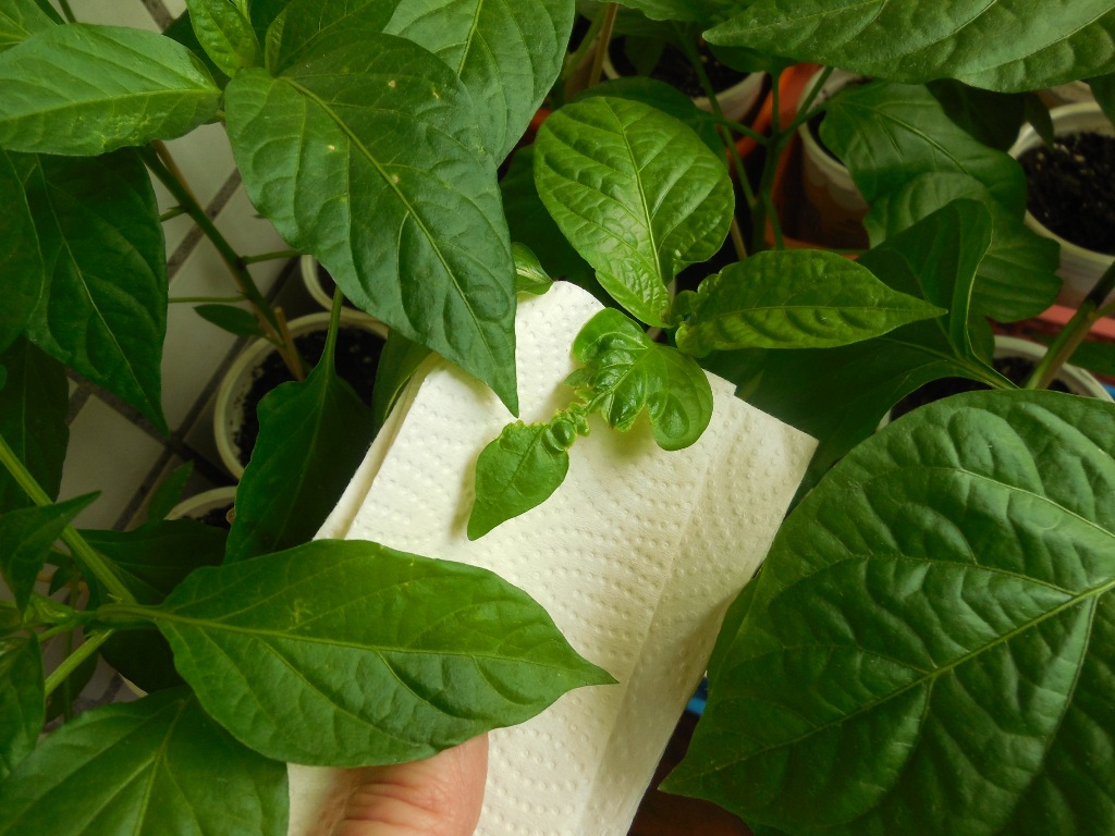Уважаемые знатоки агротехники, помогите пожалуйста советом! Вчера обнаружила на четырех перцах желтеющие молодые листики. А сегодня таких уже больше. Не пойму, чем обработать! Чего дать?