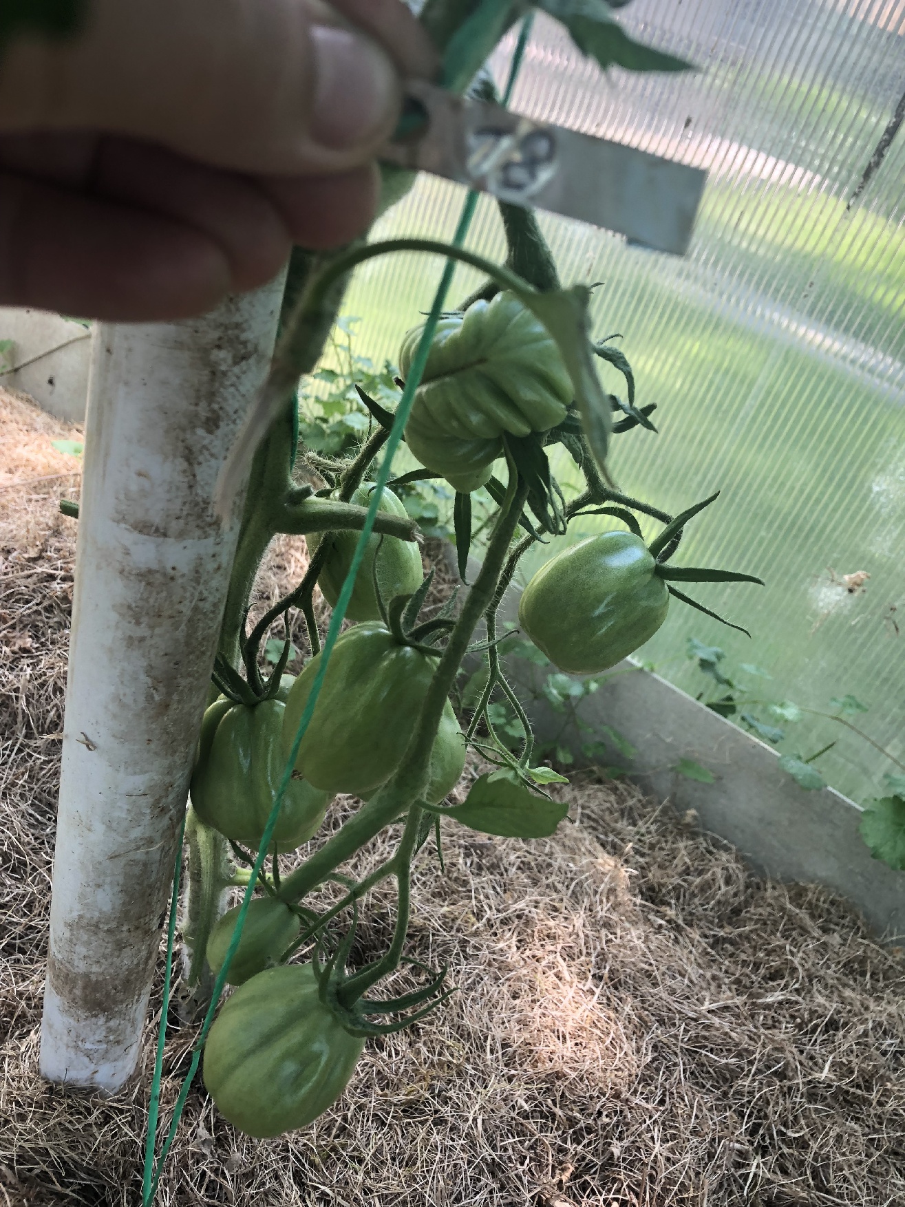 Я уже как то писала...Я делаю так: У скребки меньшим концом подхватываю кисть, а больший конец сгибаю буквой "Г" и всовываю прямо в стебель. За три года никаких болячек не было.Екатерина СПб писал(а): ↑28.06.2018, 11:07 Подскажите пожалуйста, может дурацкий вопрос - нужно подвязывать кисти, когда от тяжести заломчик образовался? Или через этот залом всё равно питательные вещества поступают и ничего не трогать? Если подвязывать - то может какие ноу-хау есть? А то у меня и так лес из веревок, вчера начала эти кисти вязать, так вообще не продраться.