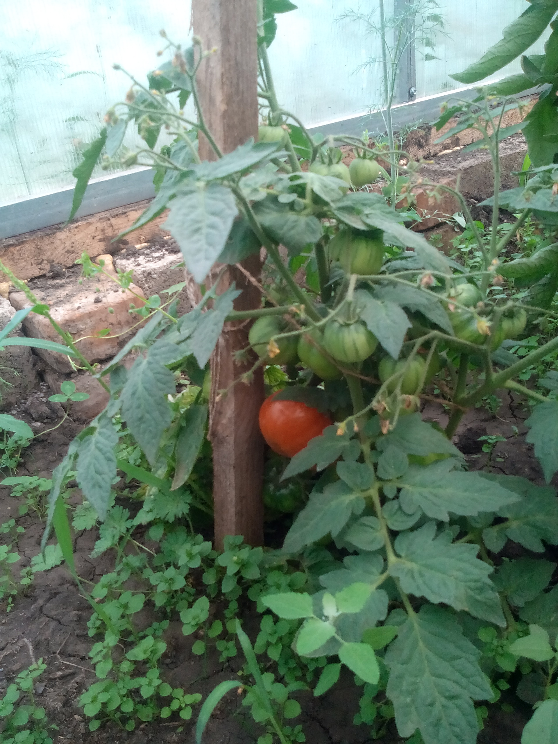 Это я уехала отдыхать на 10 дней, приехала - не поняла, думала всё зарастет, а там даже пасынков не наросло.. и не завязалось ничего нового, все цветки засохшие висят... и этот помидорчик с гнилой попкой ((