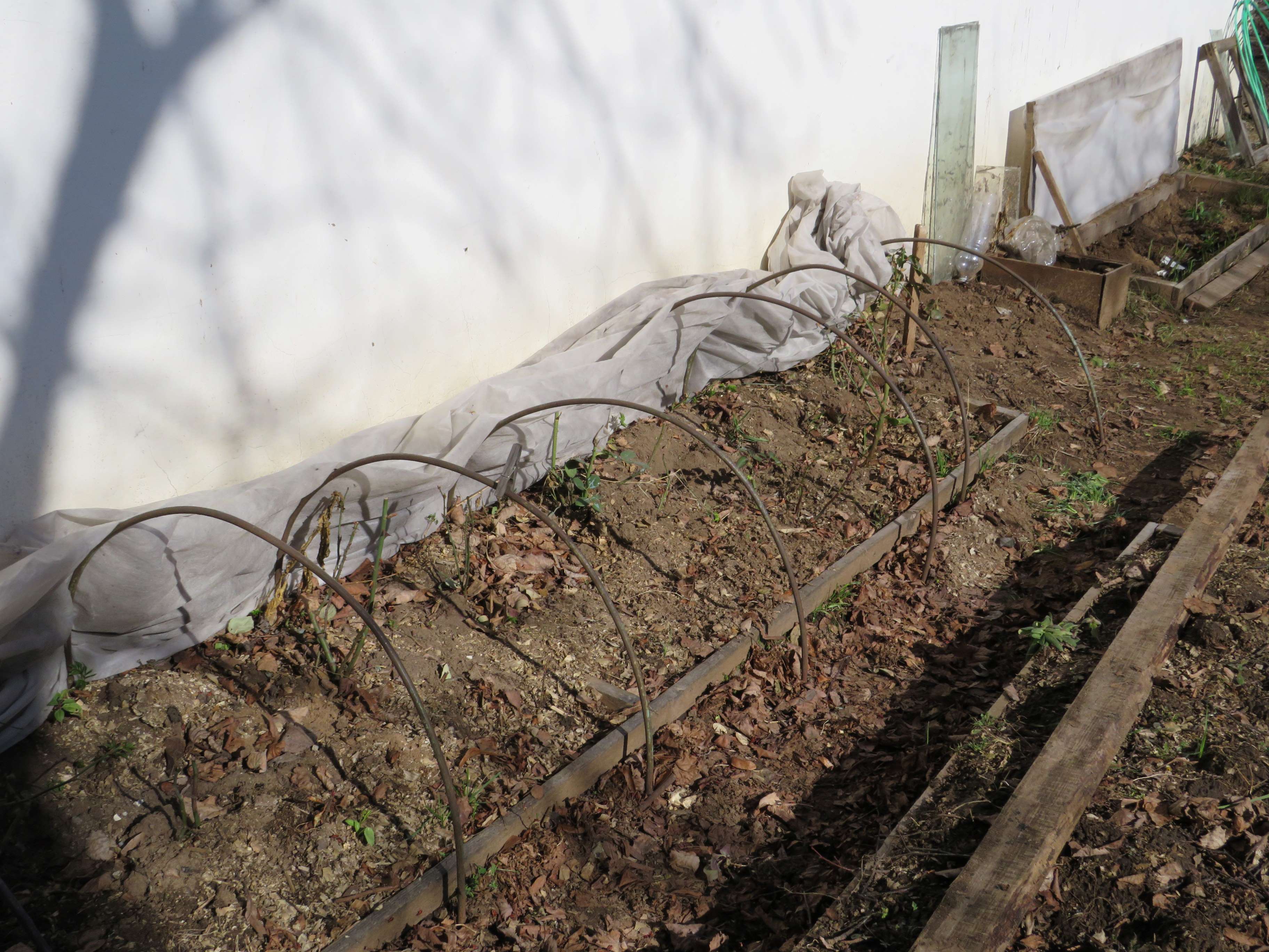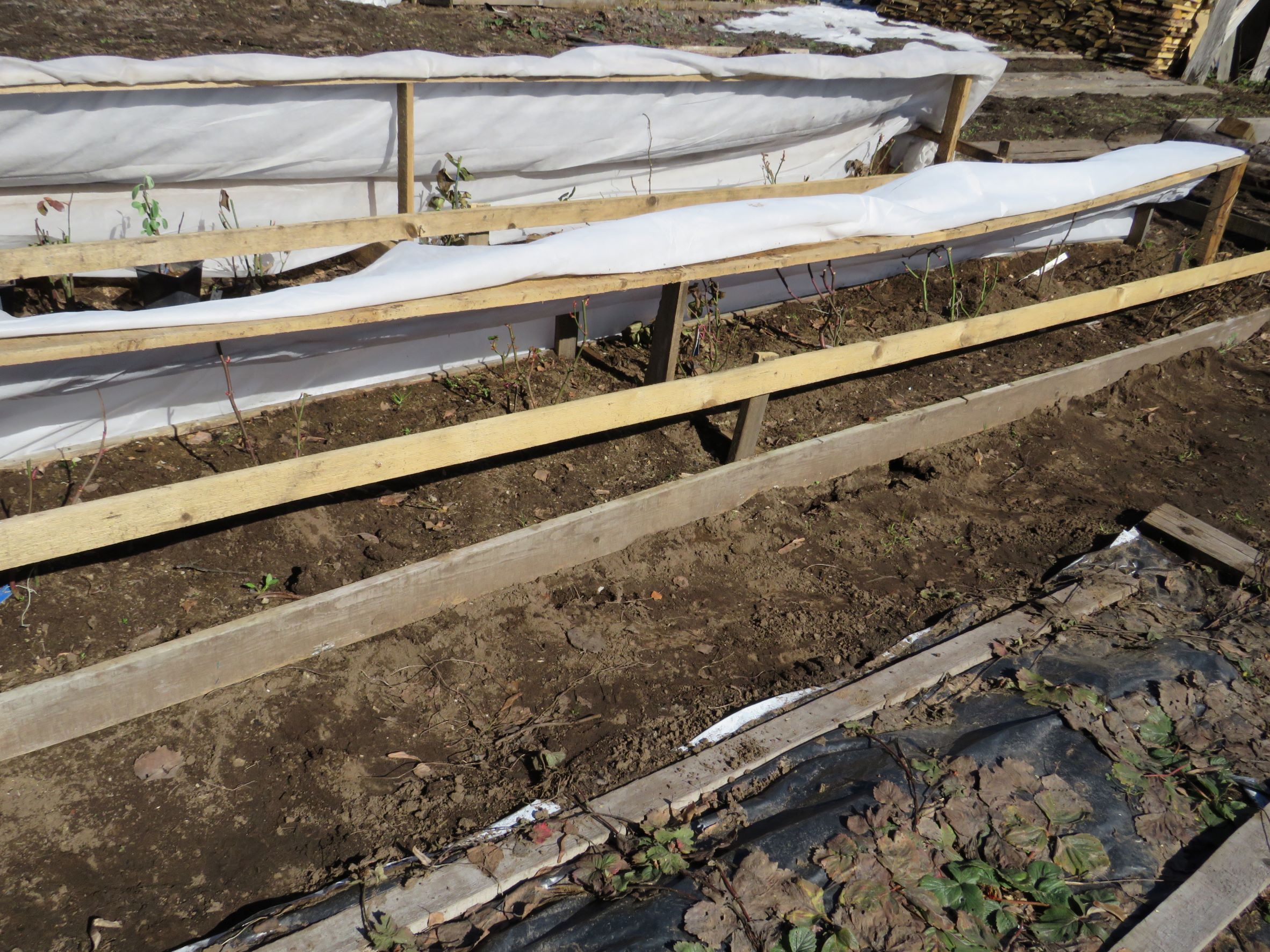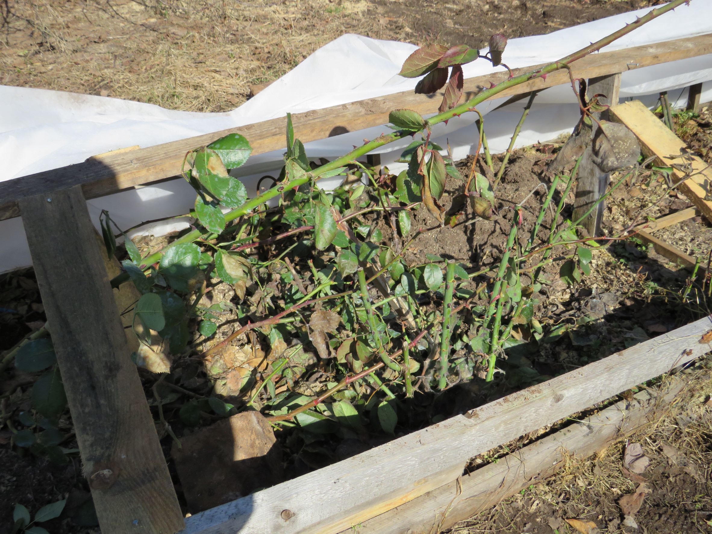 У соседа стоял куст вьющейся розы, закутанный как всегда покрывным материалом - тоже почернел, ждет, что от корней пойдет.