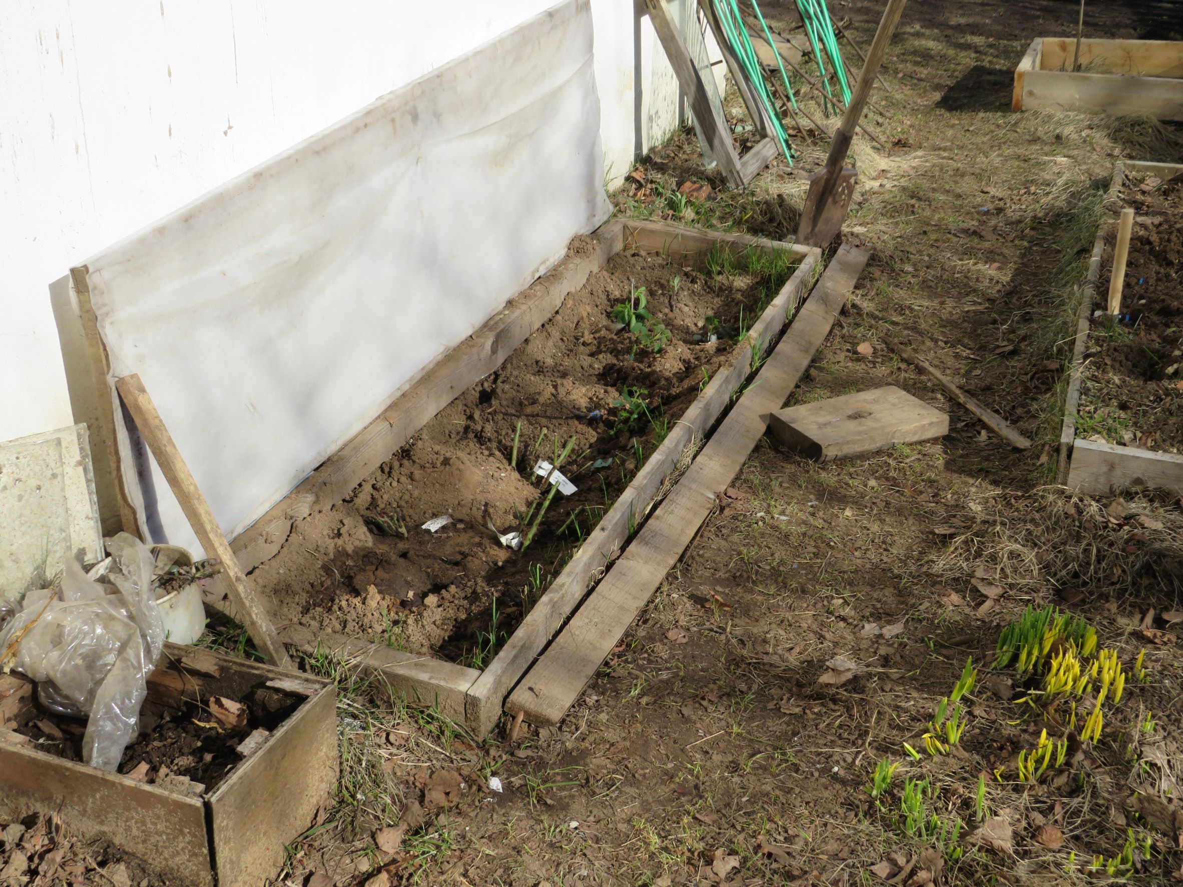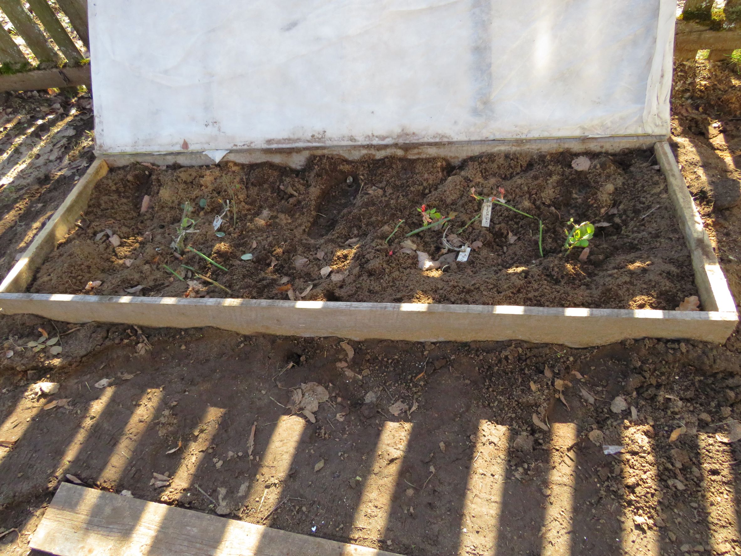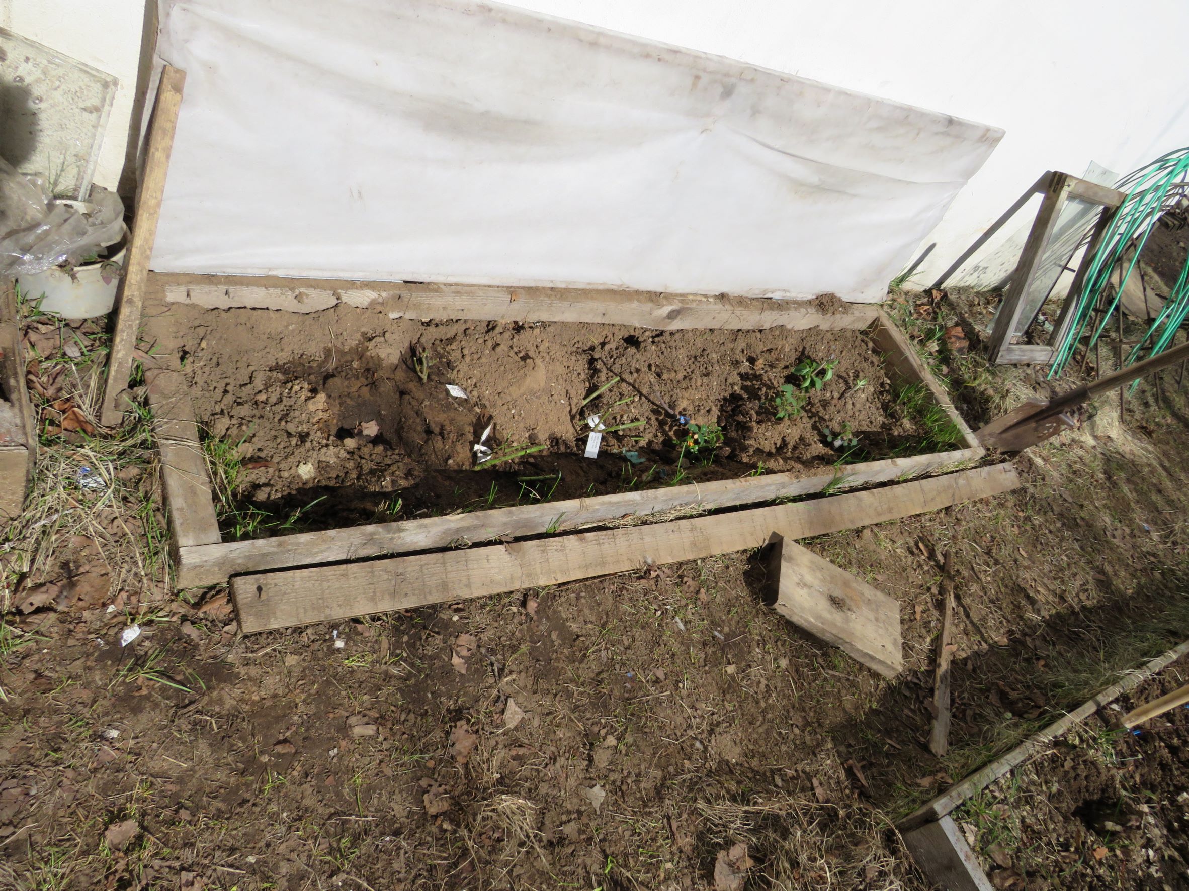 У соседа стоял куст вьющейся розы, закутанный как всегда покрывным материалом - тоже почернел, ждет, что от корней пойдет.