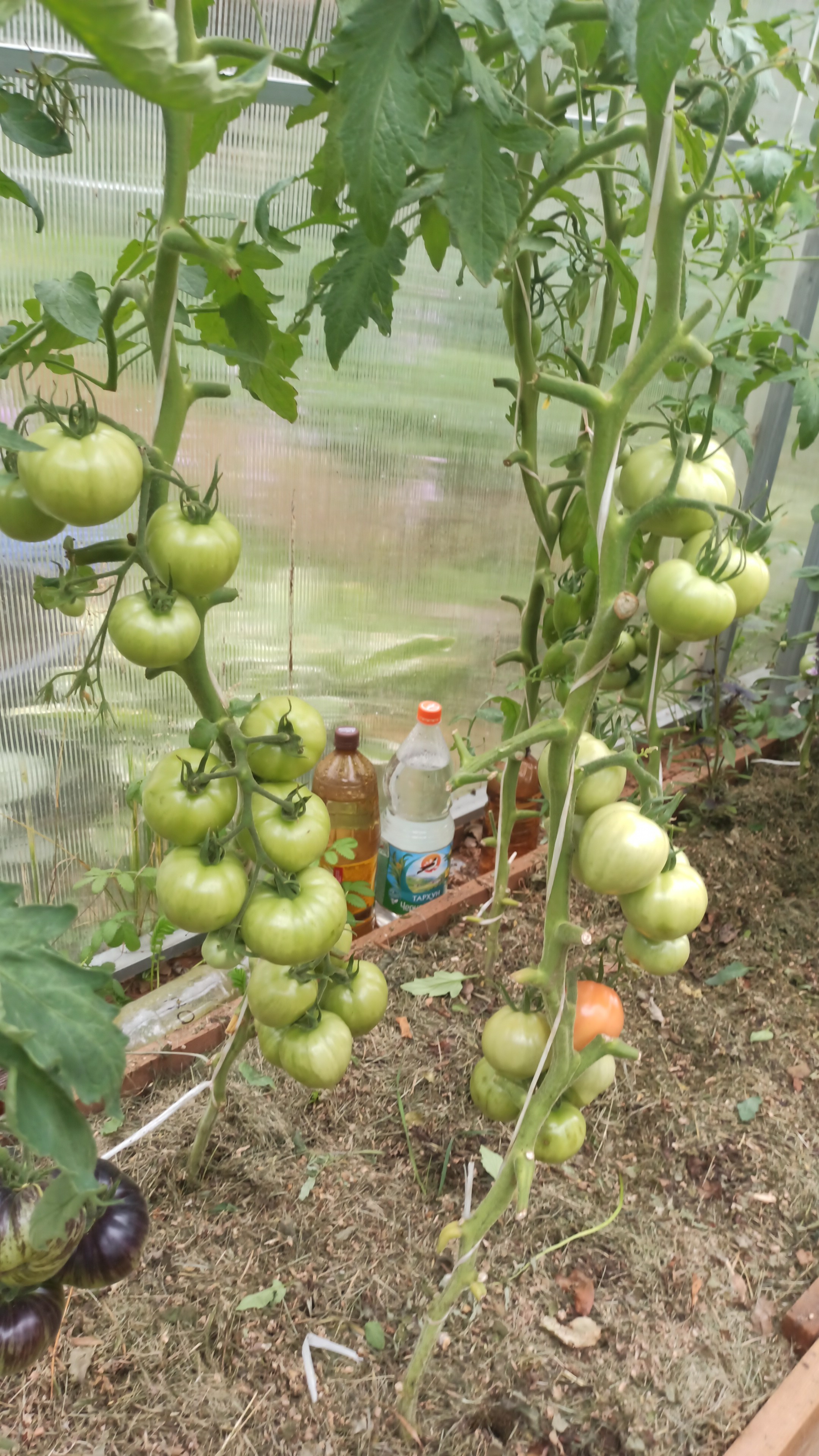 На крупноплодниках 3-я 4-я кисть сгорели напрочь, редко где по 1-2 помидорки завязалось, но и те плохо опылились, толку мало будет.
