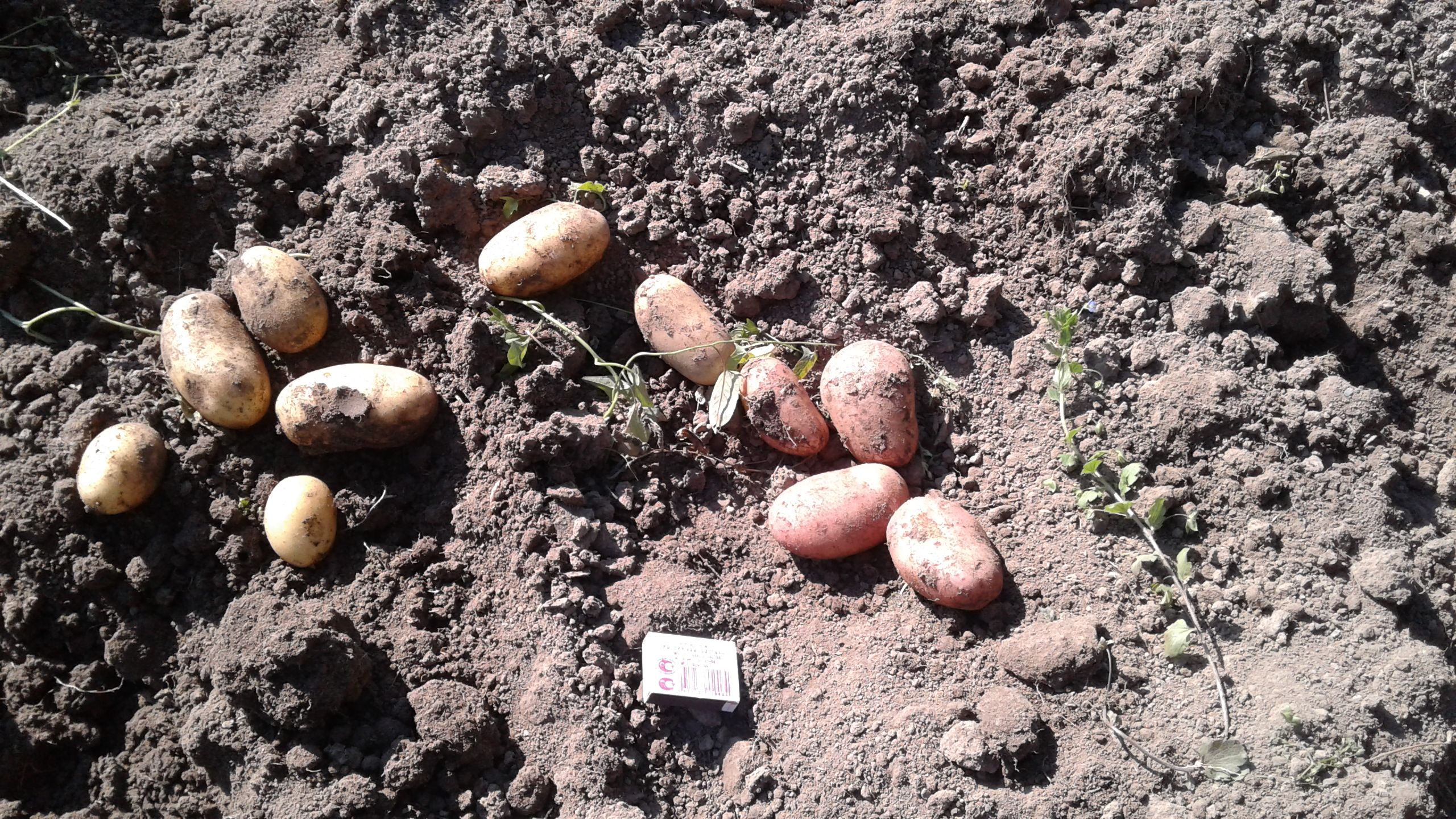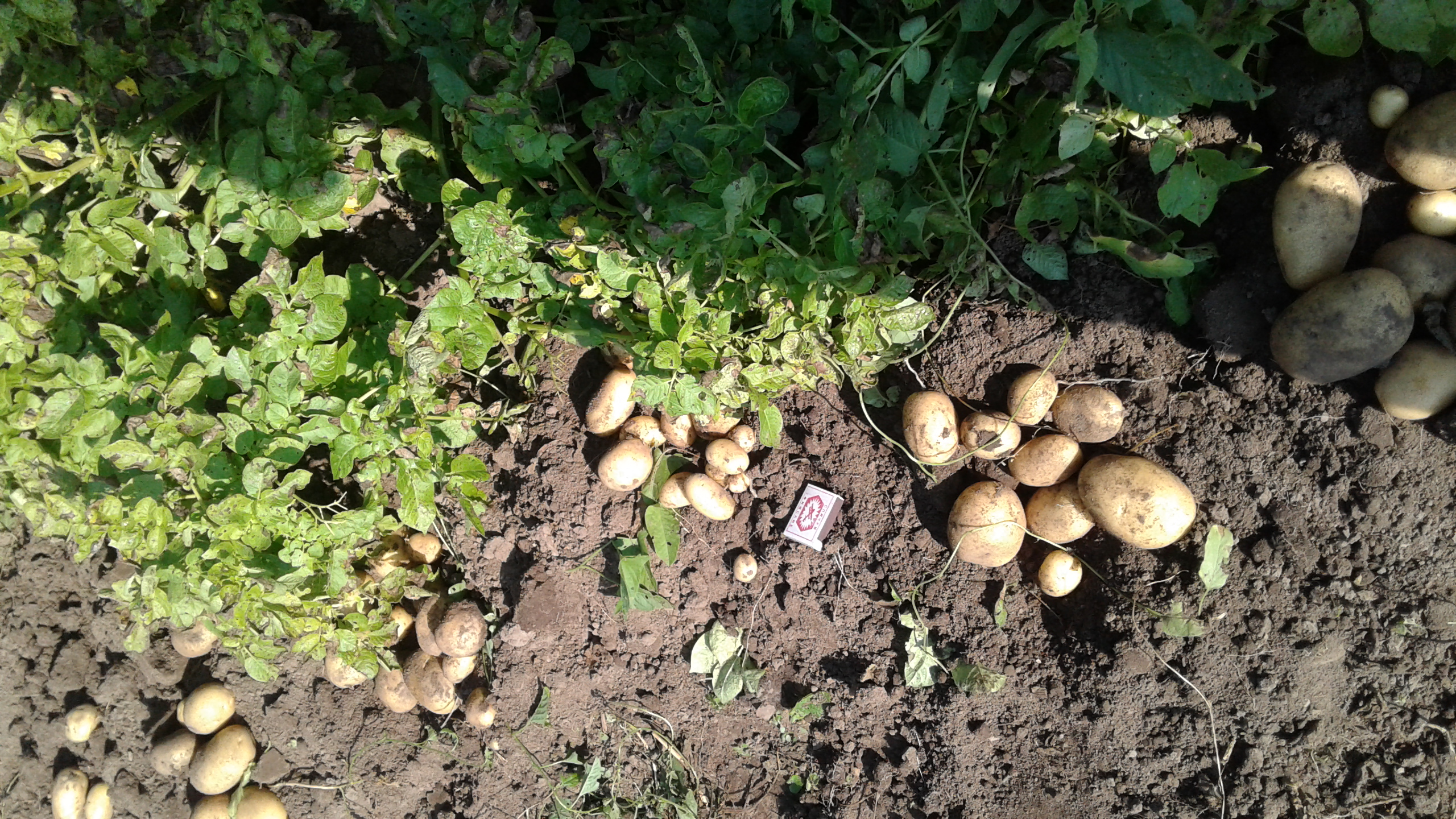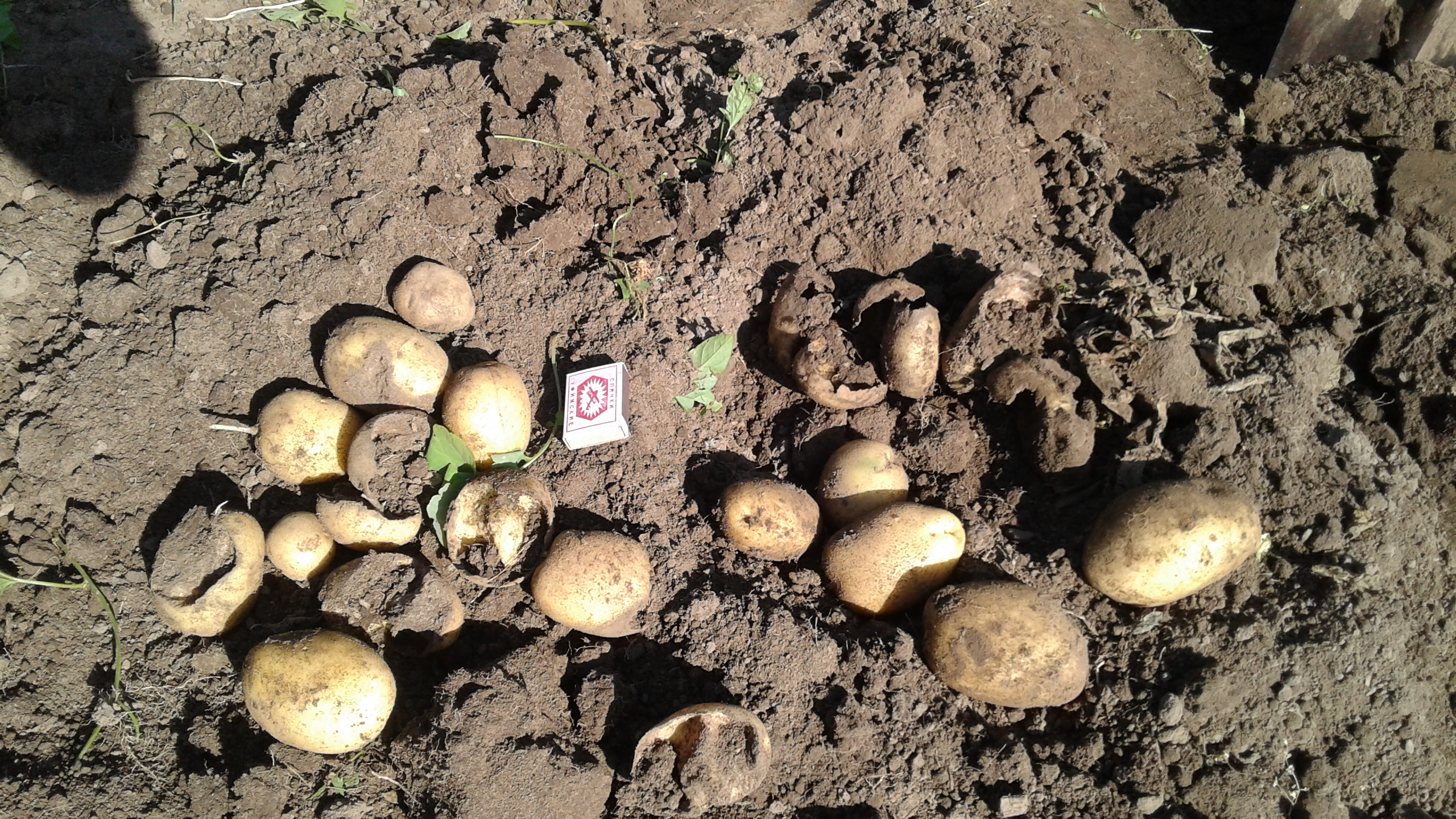 ; 4-8 крупных клубней в кусту, очень сложно взять на посадку, придется резать. На резку сорт реагирует спокойно, вполне рабочий вариант. Не особо правильная форма клубней, глубокие глазки. Но неплохой урожай, на 15 кустов два 12л ведра с горкой и уникальная живучесть. Продегустирую зимой и может быть расширю посадку.