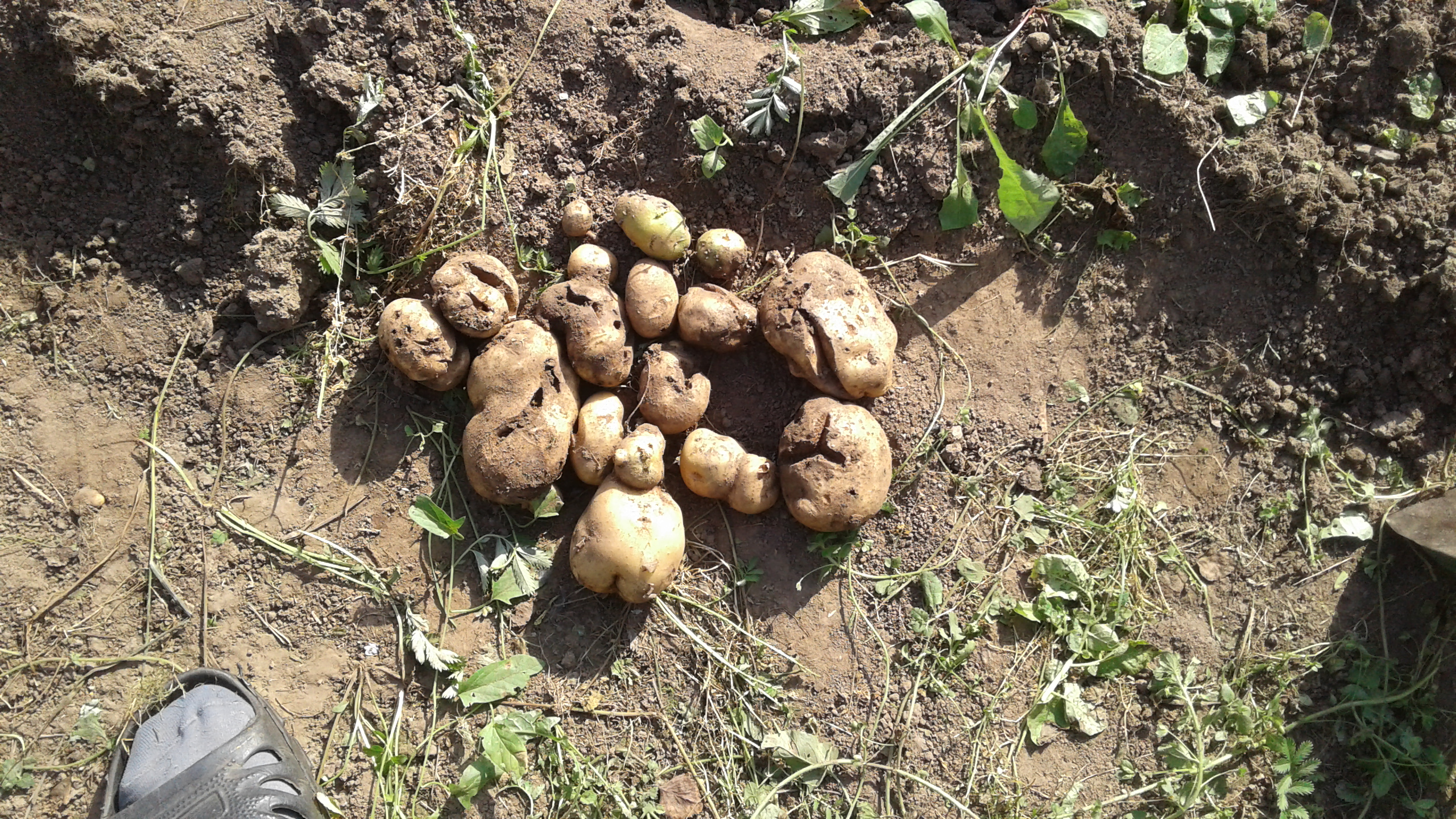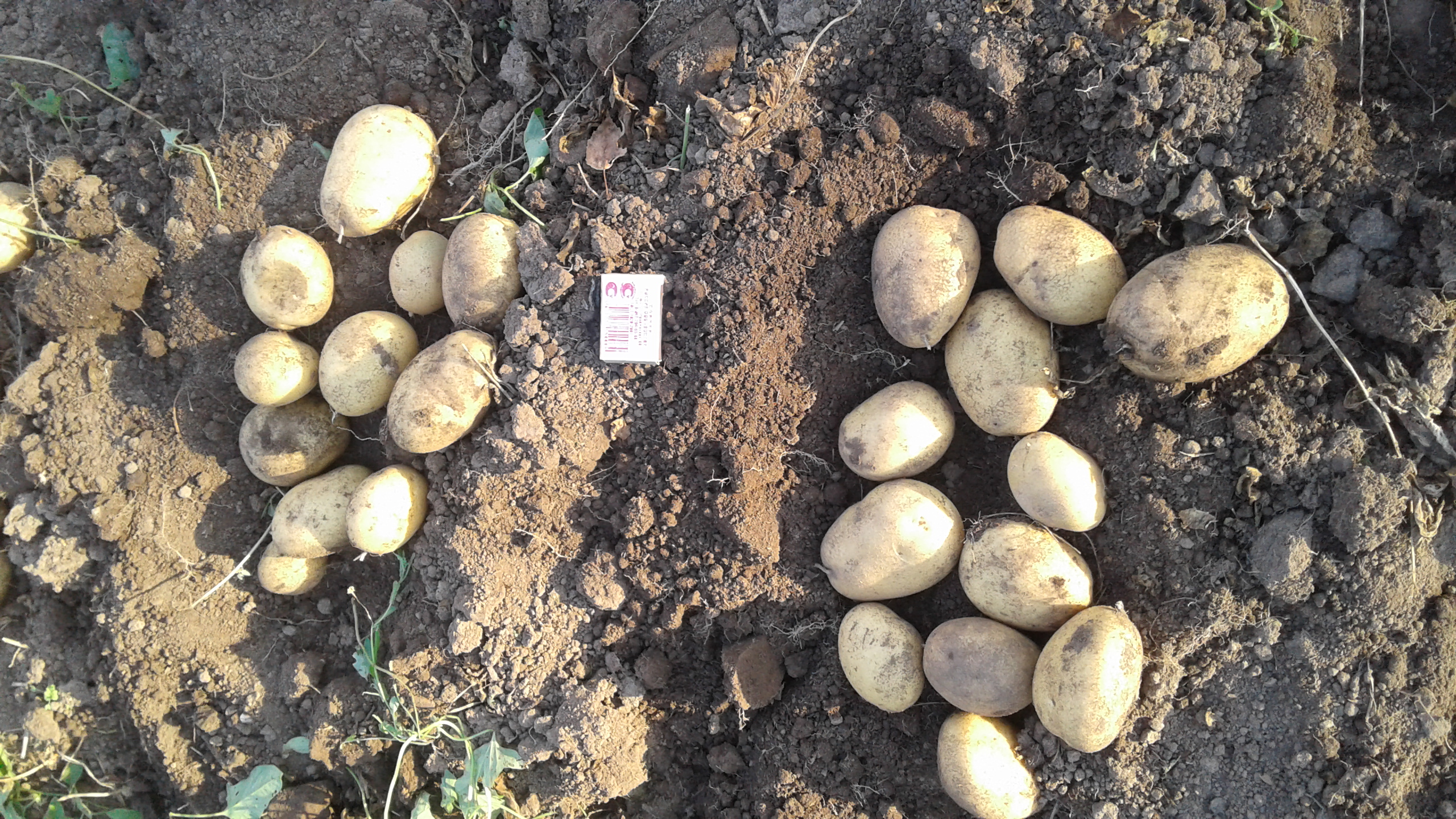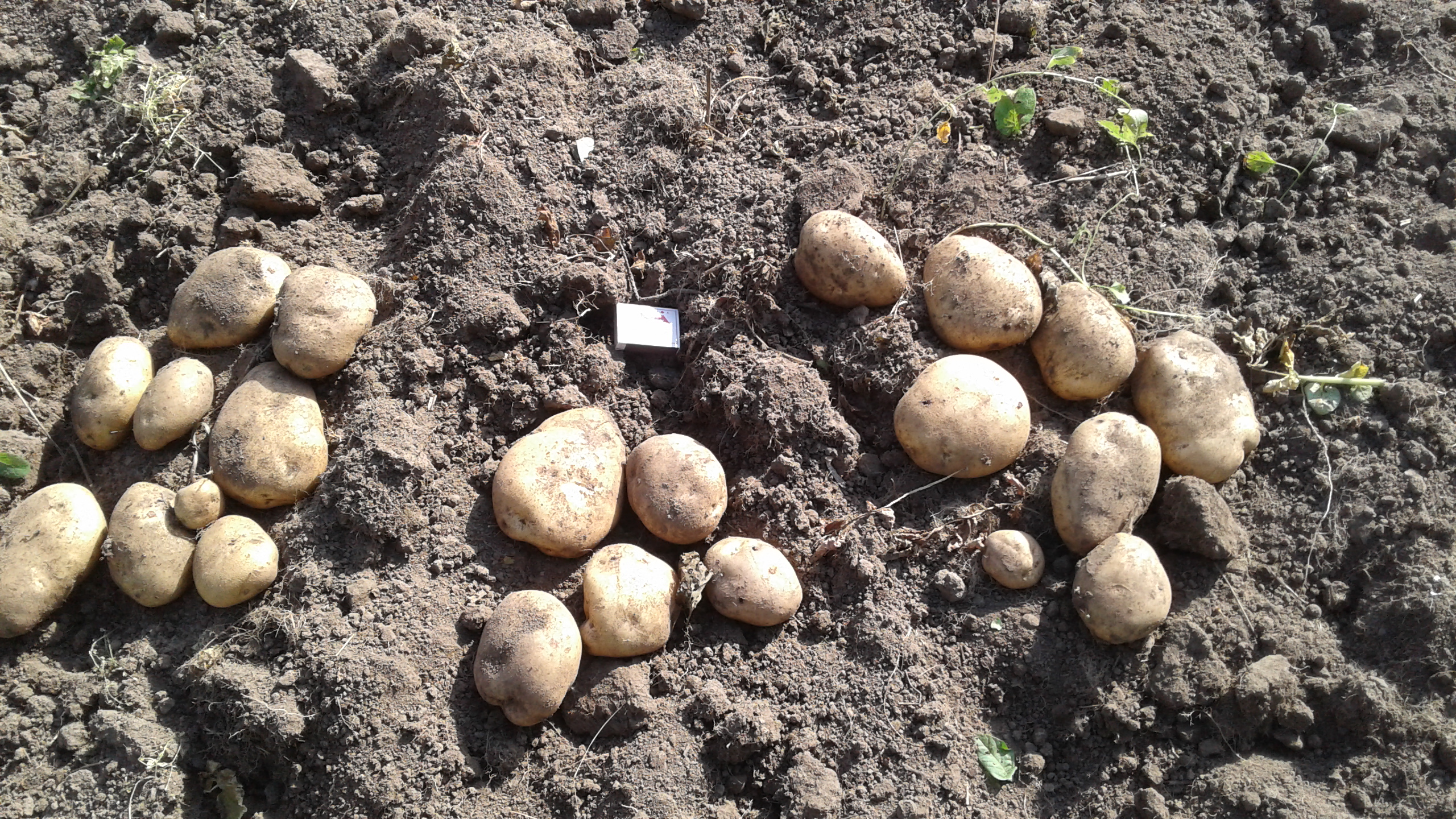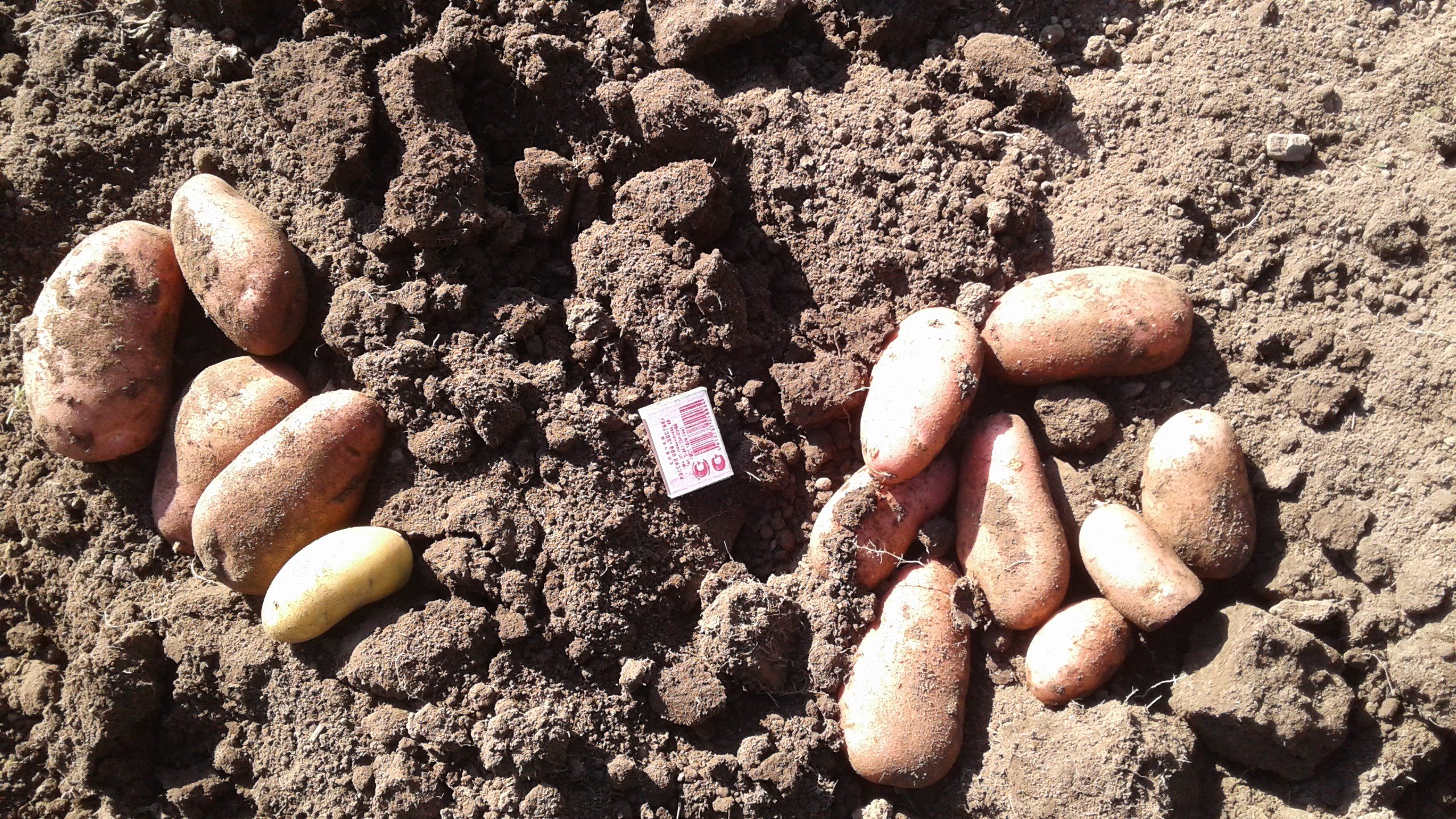 ; 4-8 крупных клубней в кусту, очень сложно взять на посадку, придется резать. На резку сорт реагирует спокойно, вполне рабочий вариант. Не особо правильная форма клубней, глубокие глазки. Но неплохой урожай, на 15 кустов два 12л ведра с горкой и уникальная живучесть. Продегустирую зимой и может быть расширю посадку.