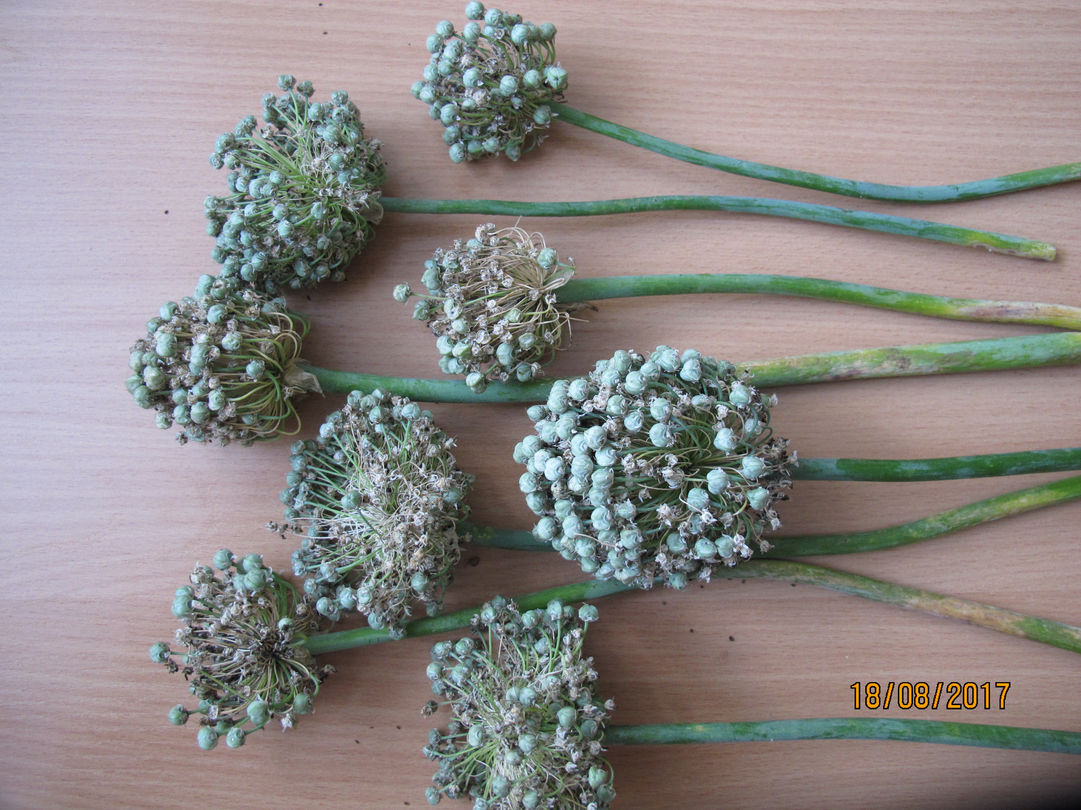 Я весь лук сдернула и Эксибишен тоже, пероноспороз листья уже побил. Размерчик маловат в этом году, обычно больше раза в два бывает. Очень туго рос в майско июньские холода. Семян своих похоже не получится. Цветет во всю, но вряд ли созреет, даже если теплый сентябрь будет. Сами стрелки тоже больные все.