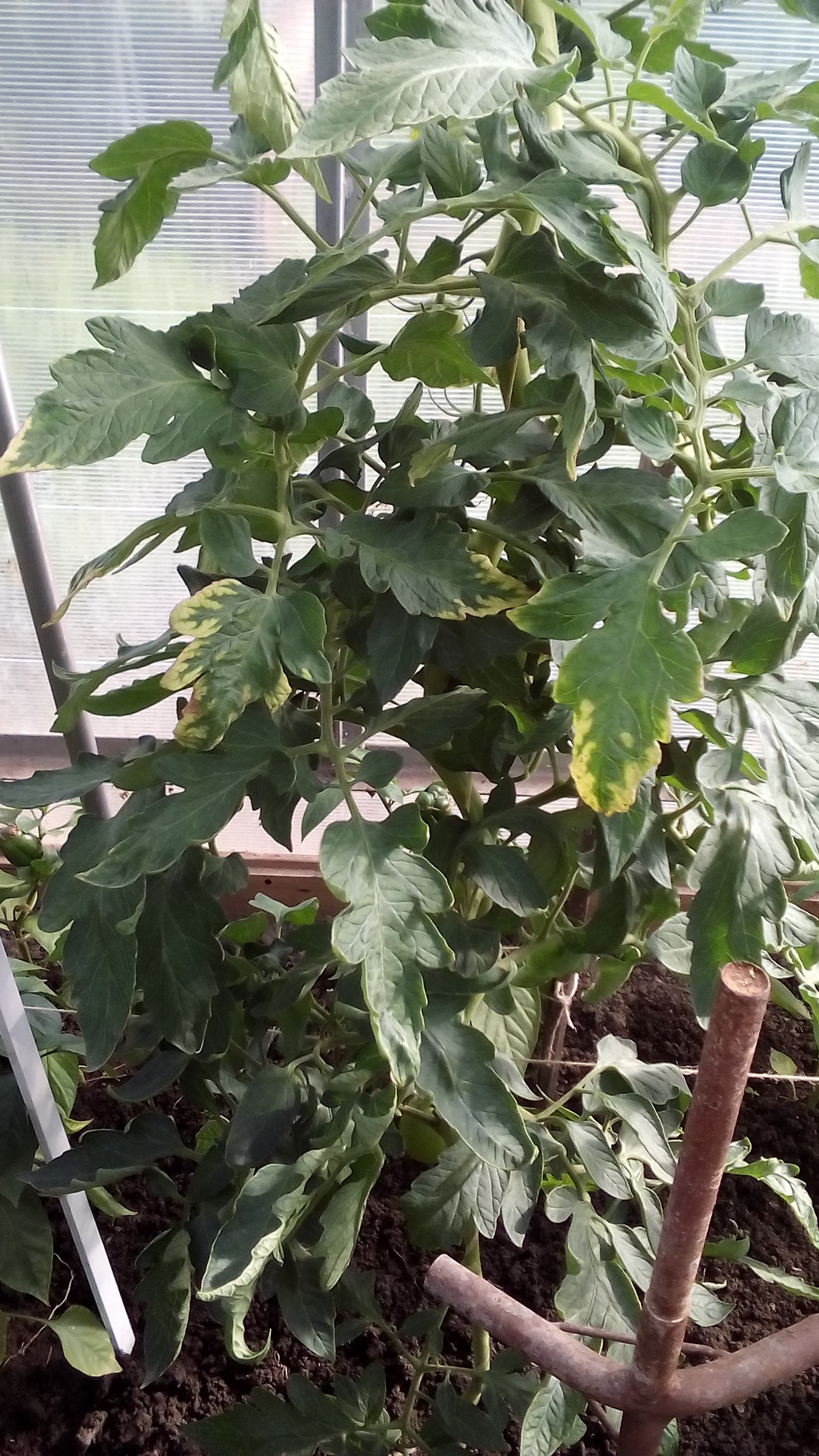 Фото томата, у которого после подкормки золой появились жёлтые пятна на листьях в середине растения. С виду похоже на недостаток магния. Утверждение Бобра о том, что перекорм золой не может привести к дифициту магния считаю ошибочным.