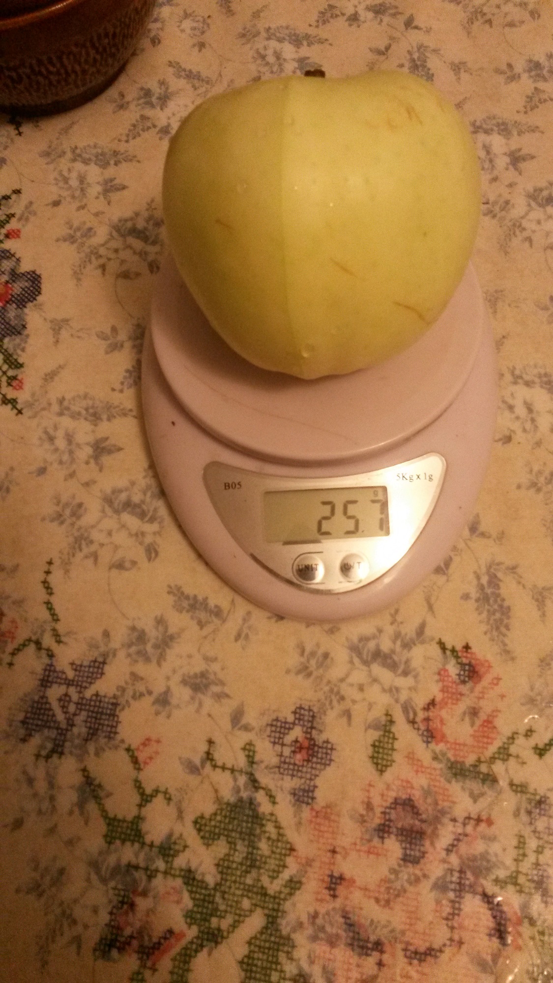 Параметры яблока: средний диаметр - 10 см, вес - 393 г. Яблоко - гигант. По консистенции - каша, но сочная и приятная на вкус, которую не противно жевать. Идеально будет пожилым людям - жевать почти не нужно.