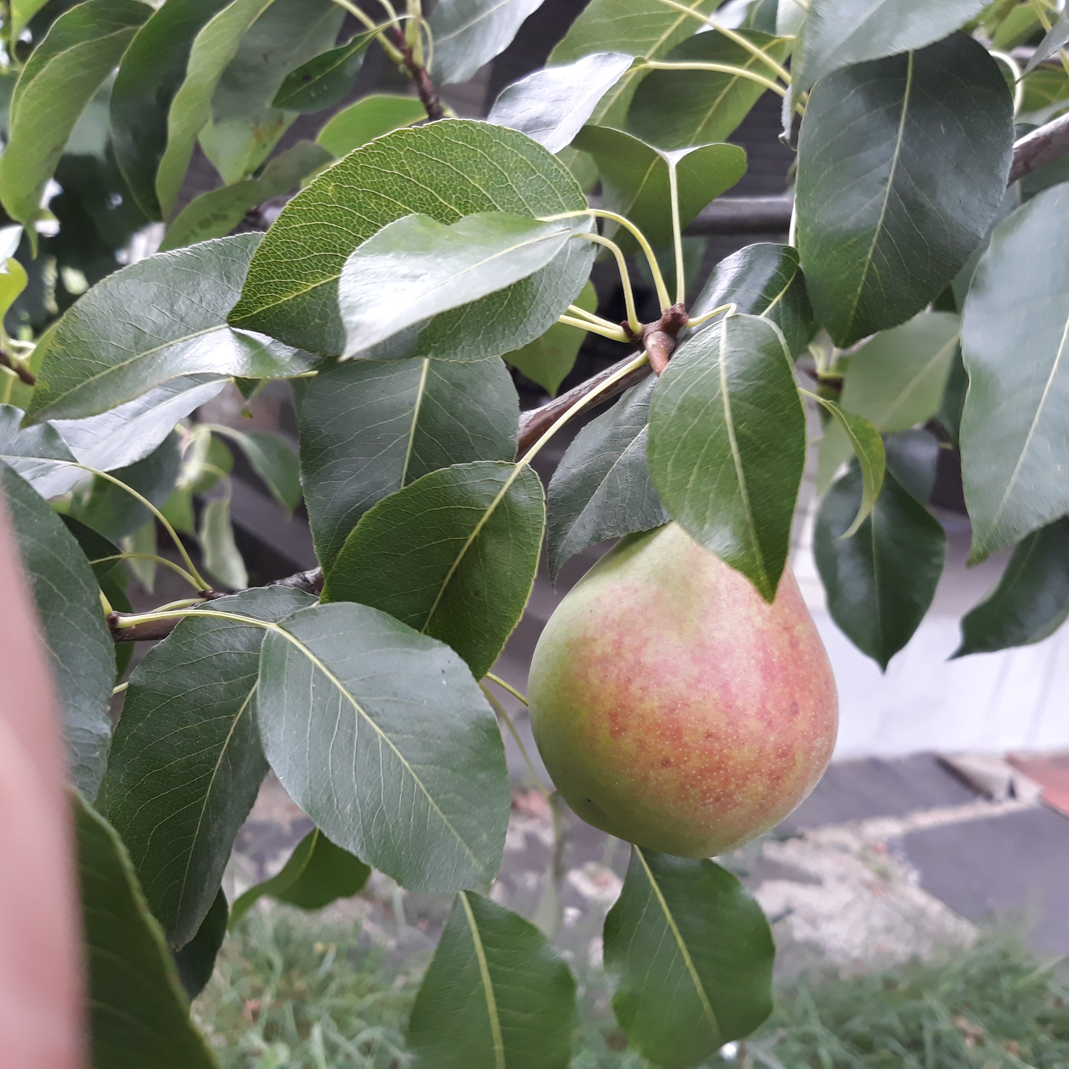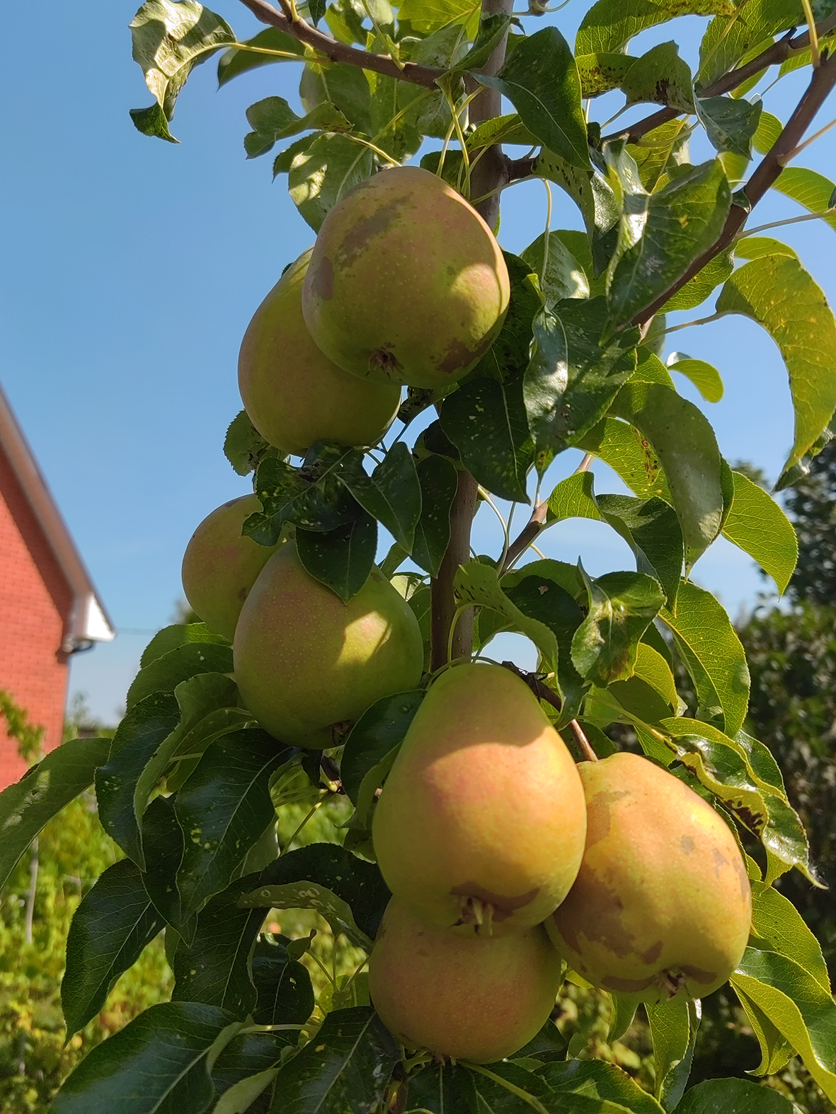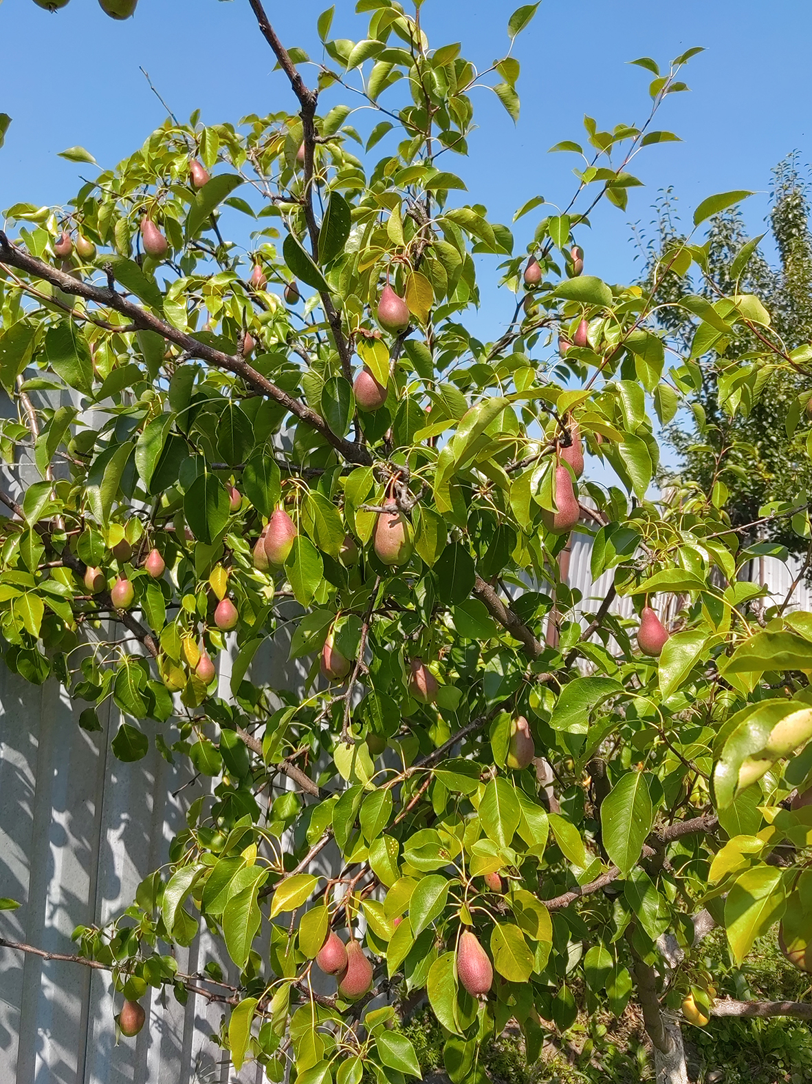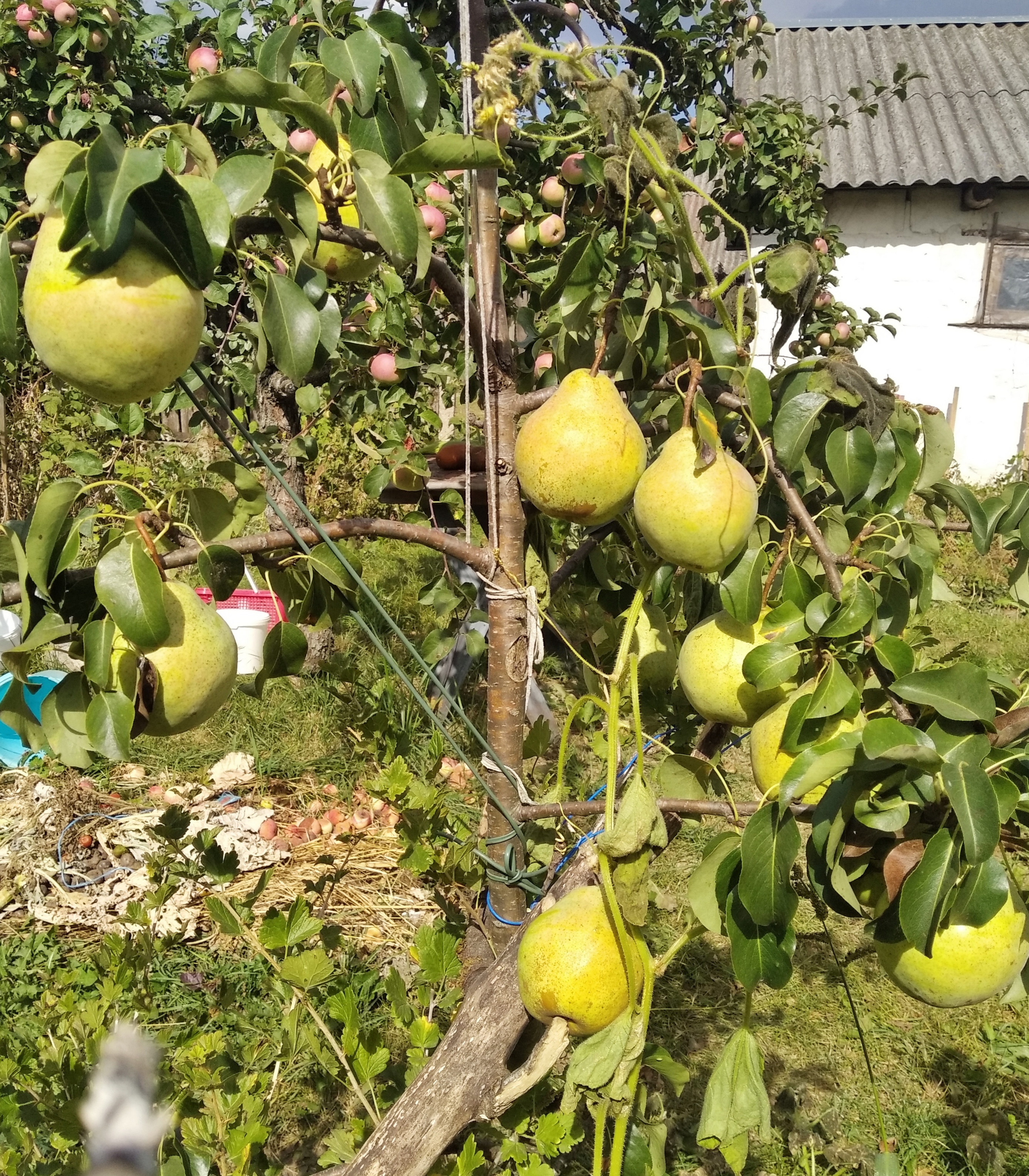 Моя Просто Мария наконец то завязала 22 груши на пятом году после посадки однолеткой, в прошлом году завязь сбросила. Груши огромные и ветки под тяжестью согнулись параллельно стволу, в один момент ствол даже накренился в одну сторону из-за рыхлой сухой земли и показались корни, так я подперла ее толстым суком и хорошо полила. Одну самую красивую сорвала, она висела очень неудобно. Попробуем через неделю. Плоды твердые, тоже думаю, что снимать ещё рано. Дерево сформировалось не совсем правильно, голенастое, в одном месте прививки не прижились, в другом слишком сильно оттянула шпагатом и при ветре ветка сломалась. Думаю, что с ростом оно выправится.